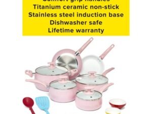 Tasty Ceramic Titanium-Reinforced Cookware Set, Pink, 16 Piece