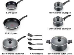 T-fal Cook & Strain Nonstick Cookware Set, 14 piece Set, Black