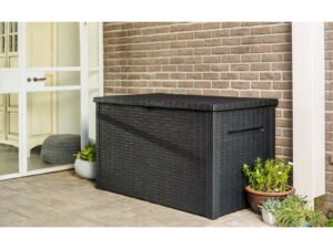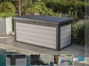 Keter Premier Outdoor 150 Gallon Wood and Resin Deck Box, Black and Gray