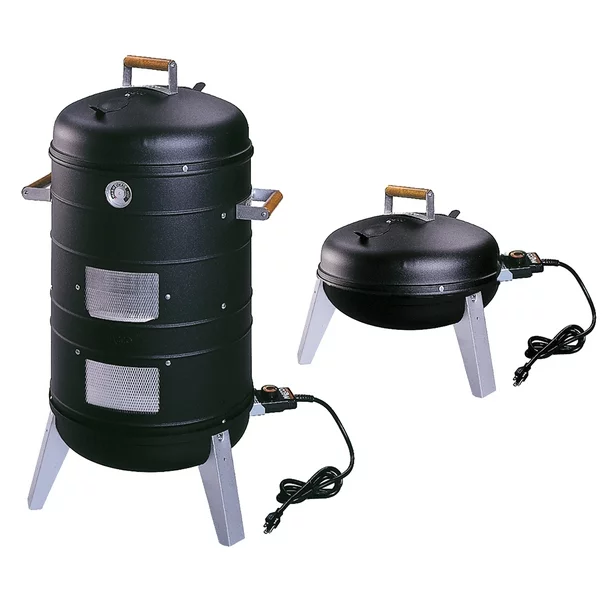 Perfect your back yard barbecuing with the Americana 2-in-1 Electric Water Smoker. This chimney-style smoker offers easy side access doors to monitor water and wood chips. Keep careful track of the temperature with the built-in temperature gauge. The 5.5 quart water pan and flavor channels ensure tender, moist, delicious smoked foods. When you are on the go the base and the hood of the smoker interlock to convert into a Lock ‘N Go electric grill. This electric smoker/grill can plug into any standard outlet. Savor slow-cooked foods or enjoy burgers at the lake with this versatile smoker and grill.