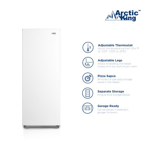 The Arctic King 7.0CF Upright Freezer, White has the ideal amount of space for stocking up on your favorite frozen foods whether you’re having a big family gathering or simply want to store for the future. The Arctic King Upright Freezer can be used at home in offices, mudrooms, garages and basements where it provides supplemental freezer space. The skinny size and recessed handle of the Arctic King Upright Freezer makes it an excellent fit in another storage space in your house for easy access. Includes a mechanical temperature control so you can change it higher or lower with an adjustable thermostat. The Arctic King Upright Freezer has an easy-to-clean interior for added convenience. The drain plug allows for easy cleaning and manual defrosting. Offering a wide range of temperatures, the goodness of your favorite foods is locked in for longer. With an interior that’s easy to clean, the freezer door opens at increments from 45-75 degrees so you can easily pack and unpack your favorite foods. The Arctic King Upright Freezer features a balanced hinge design, so you can ensure that you can get in and out of it with ease. You will have top quality construction and proper storage with the Arctic King 7.0CF Upright Freezer, White. Arctic King 7.0CF Upright Freezer, White: