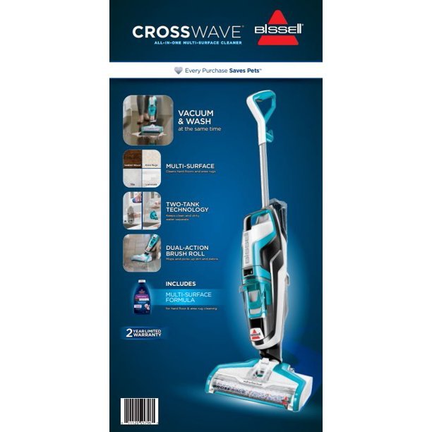 Get your hard floors cleaner than you could have ever imagined! The BlSSELL CrossWave is a revolutionary, all-in-one, multi-surface cleaning system that vacuums and washes floors at the same time. With a Dual-Action Brush Roll rotating at 3,000 RPM and an innovative multi-surface cleaning solution, the CrossWave cleans better than a sponge mop and bucket, in less time. Plus, with the touch of a button, you can seamlessly switch from cleaning hard floors to vacuuming and washing your area rugs. All with one machine. What Comes In The Box Multi-Surface Brush Multi-Surface Cleaner (8oz Pack-In) Parking Tray