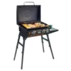 The Blackstone 22″ Table Top Griddle station is compact and convenient. At 339 sq. inches of griddle cooking surface, this unit gives you two independent cooking zones, with two independent knobs with built-in igniters. The two “H” style burners provide even heat distribution for optimal cooking across the whole griddle. Lightweight Design; Runs off of a one pound bottle;Rear grease management. Black/Silver.