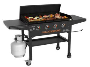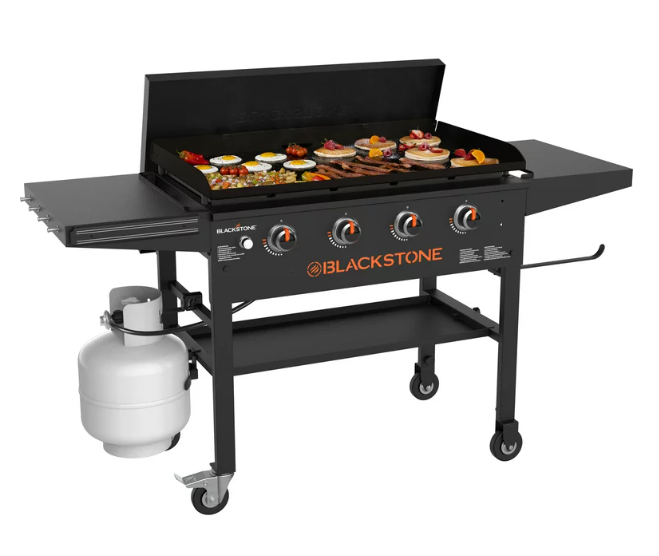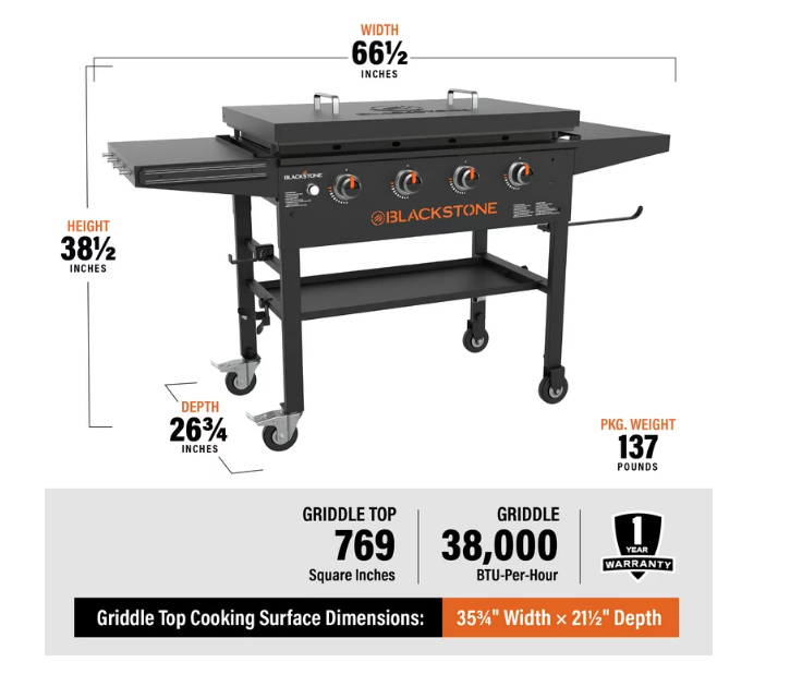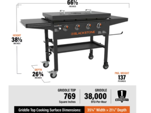 Show off your cooking skills with the Blackstone 36″ Griddle Cooking Station, now featuring the Blackstone Omni Griddle Plate. This large griddle with four independently controlled cooking zones is just what you need for your backyard parties, barbecues, and campouts. The propane-fueled Blackstone 36″ Griddle gives you 768 square inches of cooking space for the best griddling experience. On top of that, this griddle provides you with four independent cooking zones so you can cook everything at the same time at different temperatures. The new and improved Omni griddle plate has a patented design that heats your cooktop surface more evenly than ever before. Extra features include the side shelves that are designed specifically with your Blackstone griddle tools in mind, featuring tool hooks and a magnetic toolbar so all your Blackstone accessories are within easy reach. NOTE: This griddle is not compatible with the current Blackstone natural gas conversion kit.