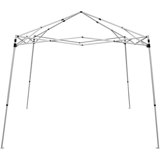 - Top provides 99% UV protection from the sun’s harmful rays. Wheeled bag for easy transport. Includes: frame, top, stake kit and roller bagWhite, steel frame. White top color10′ x 10′