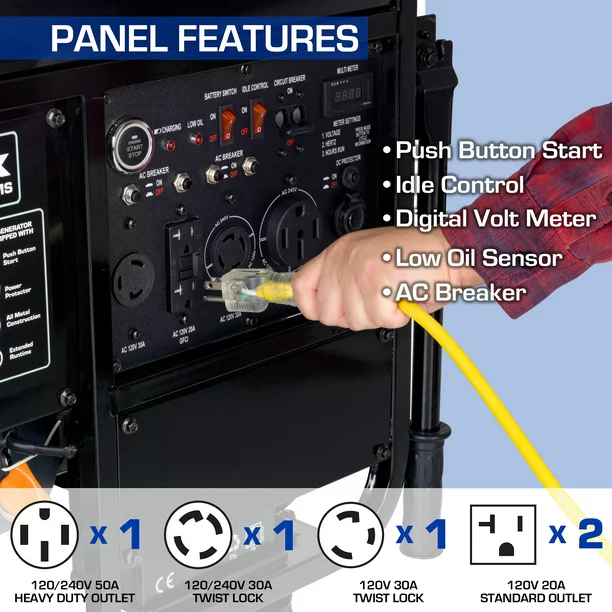 - Full power panel with oil warning light, volt meter, circuit breaker and power outlets.