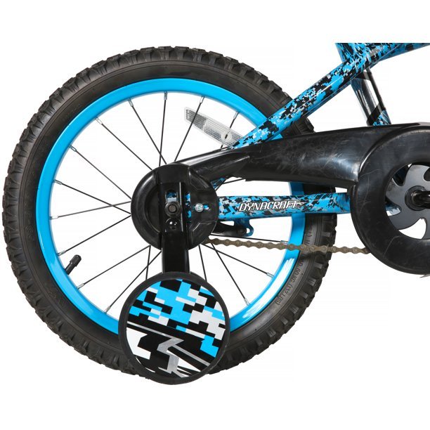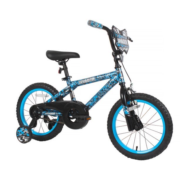 Take over the sidewalks on the Dynacraft Invader 16” Bike. This bike comes with an eye-catching, black-and-blue dipped paint finish and Invader branded handlebar shield to offer maximum cool for your little one. The quick release seat post and adjustable/removable training wheels helps the Invader grow with your little one. Command attention with the totally radical Dynacraft Invader 16” Bike.