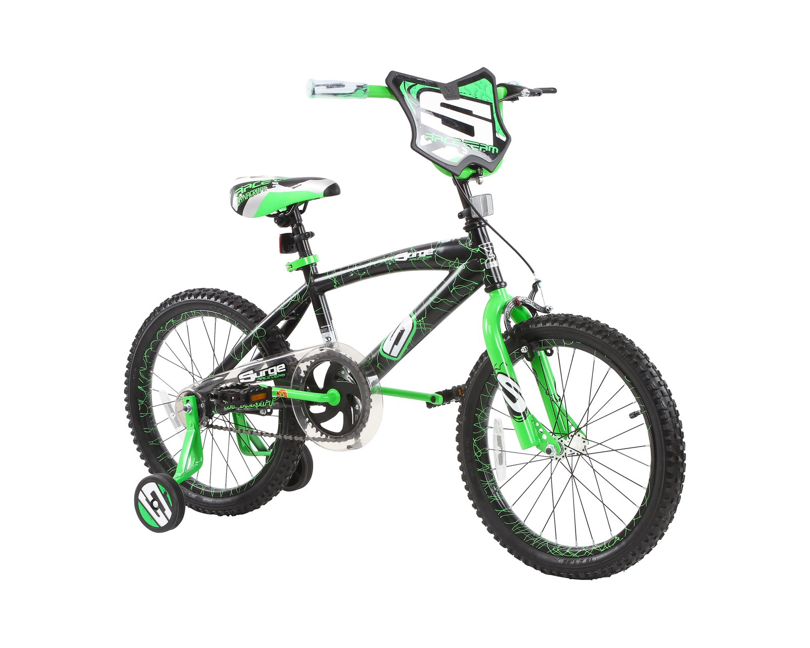 Give your young adventurer the right equipment to make the most of his riding adventures with the Next 18″ Surge Boys BMX Bike. This model comes with all the necessary components and features for a safe and enjoyable ride. It’s equipped training wheels, to give kids the motivation they need to get out and take it for a spin. A solid steel BMX frame gives this single-speed boy’s bike the stability to handle the demands of different types of roads. It provides plenty of riding power to get over small hills or cruise down flat road surfaces.Dynacraft 18 in. Surge Boys’ BMX Bike: