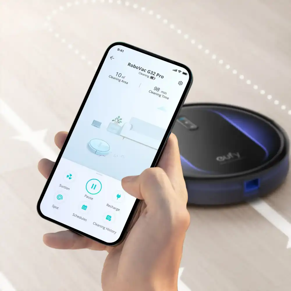 - Logically Plans Cleaning Routes: RoboVac G32 Pro efficiently cleans more floor space in your home by intelligently creating an ideal navigation path around various areas. You can also view the areas cleaned by your RoboVac G32 Pro and its runtime in the Cleaning History on the eufy Clean app. Please note that the map cannot be saved or edited.