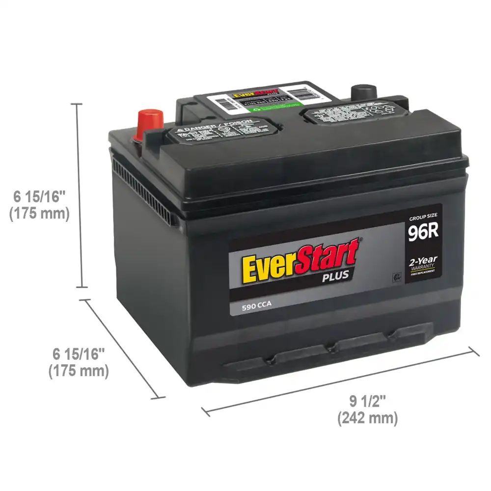 Get your car started and running again with the installation of the EverStart Plus Automotive Battery (Group Size 96R). Compatible with a range of makes, models and years, it has conveniently located top posts for easily connecting positive and negative terminals. This lead acid automotive battery delivers 590 cold cranking amps for reliable starts in all weather and can be conveniently installed and tested at a local Walmart Auto Care Center.