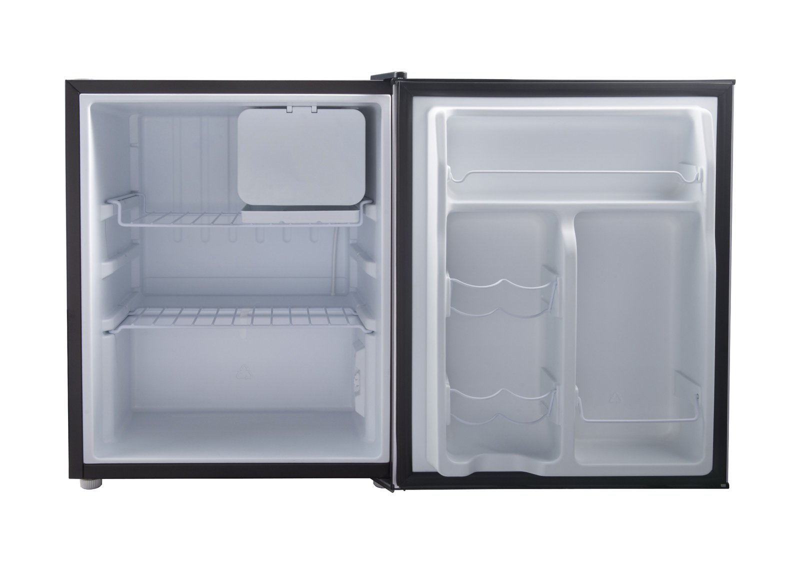Enjoy the convenience of having your favorite chilled food or drinks whenever you want with the Galanz 2.7 Cu ft Single Door Compact Refrigerator in Stainless Steel Look. This is an ideal size for the dorm room, exercise room, office, garage, game room or any other living space. This Galanz refrigerator features a half-width freezer compartment that is ideal for ice and frozen food storage. And it has excellent organizational features such as 2 coated wire slide-out shelves, 2 leveling front legs and storage for 2-Liter bottles. The convenient reversible door allows the refrigerator to open from either the left or the right side to use where ever you would like to place it. It offers a mechanical adjustable thermostat control for quick and simple temperature adjustments. It consumes less power and is energy efficient. This UL and DOE certified refrigerator is quality built and made to last.Galanz 2.7 Cu Ft Single Door Mini Fridge GL27S5, Stainless Steel: