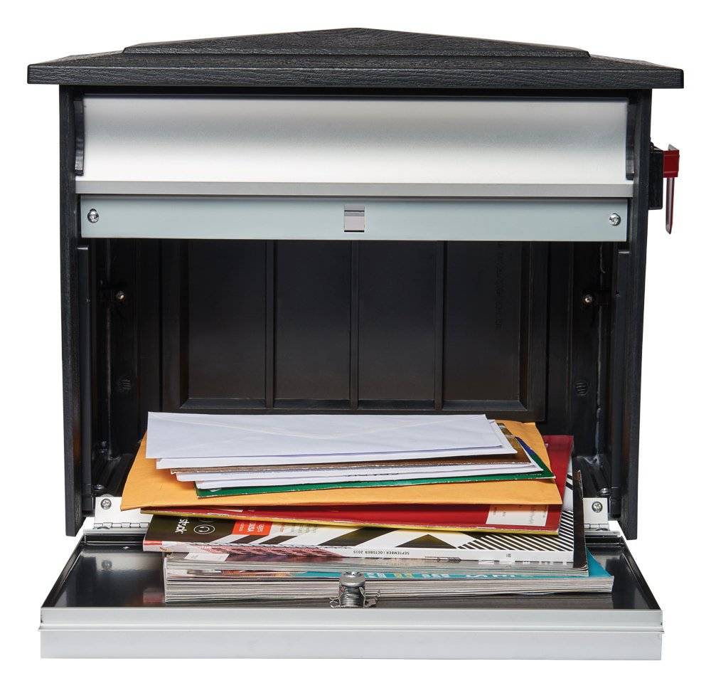 The Mailsafe is a locking security mail available in black or white with a brushed aluminum finish. It has a durable aluminum mail slot for incoming or outgoing mail. The mail is rustproof and features a large heavy-duty access door with cam lock and two keys. Mounts at residence home or at the curb.