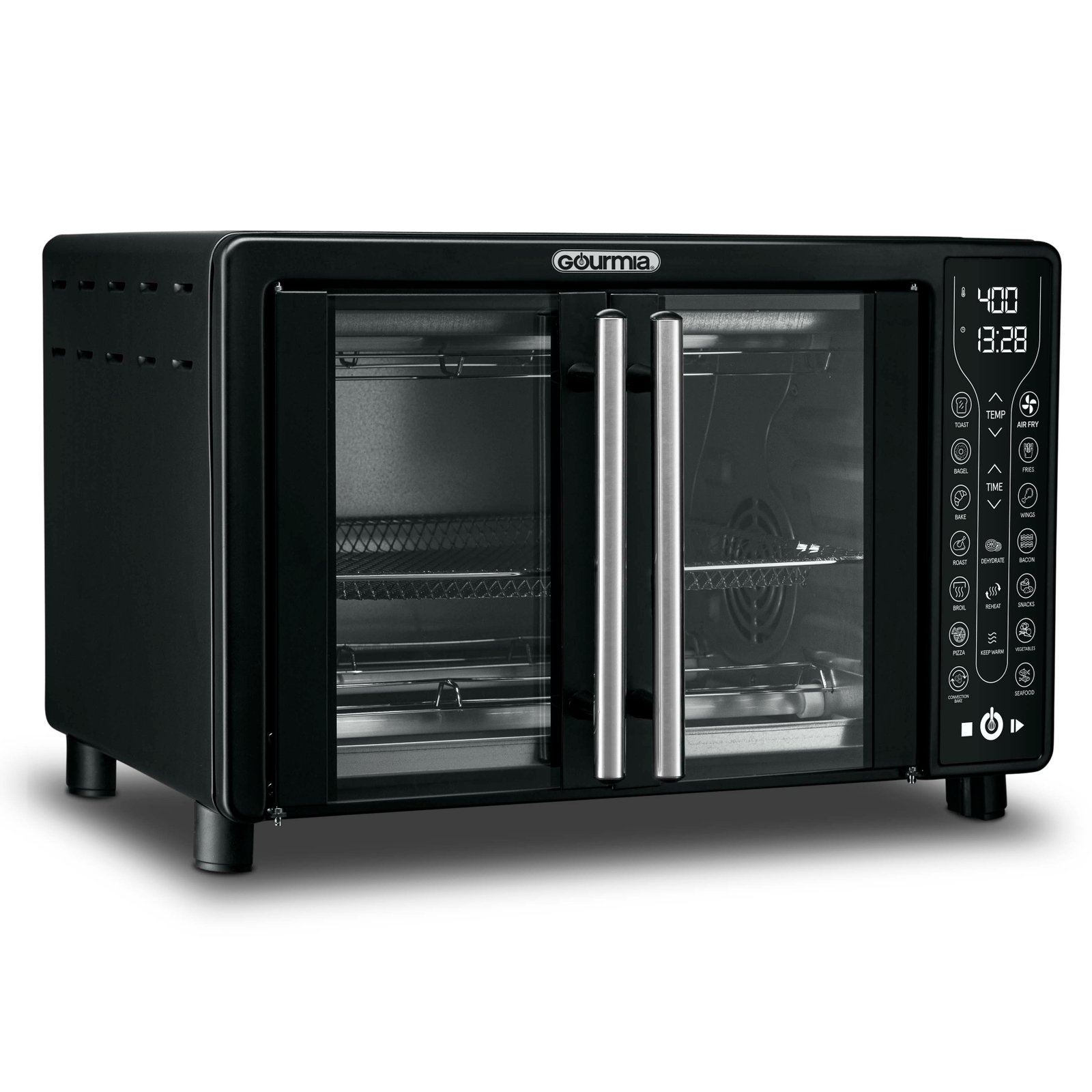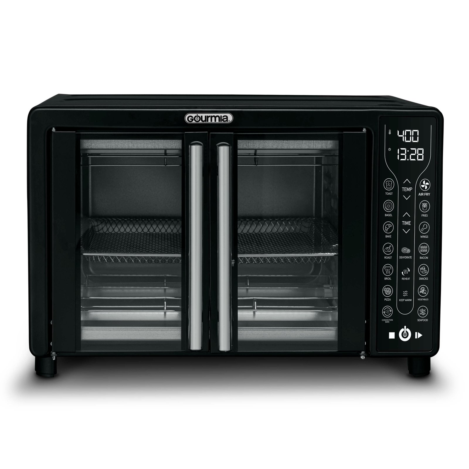 Treat yourself to healthy and delicious meals with the Gourmia Digital French Door Air Fryer Toaster Oven. Fry Force 360° Technology cooks food quickly and evenly with little to no oil. 17 One-Touch Cooking Functions allow you to air fry, bake, dehydrate and more – with just a tap. Use easy-set digital controls to adjust time, temperature, and toast settings. The oven fits a 12’’ pizza or 6 slices of bread. A large viewing window, compact design, and French doors set this Air Fryer Toaster Oven apart. Includes dishwasher safe air fry basket, oven rack, baking pan, and crumb tray.