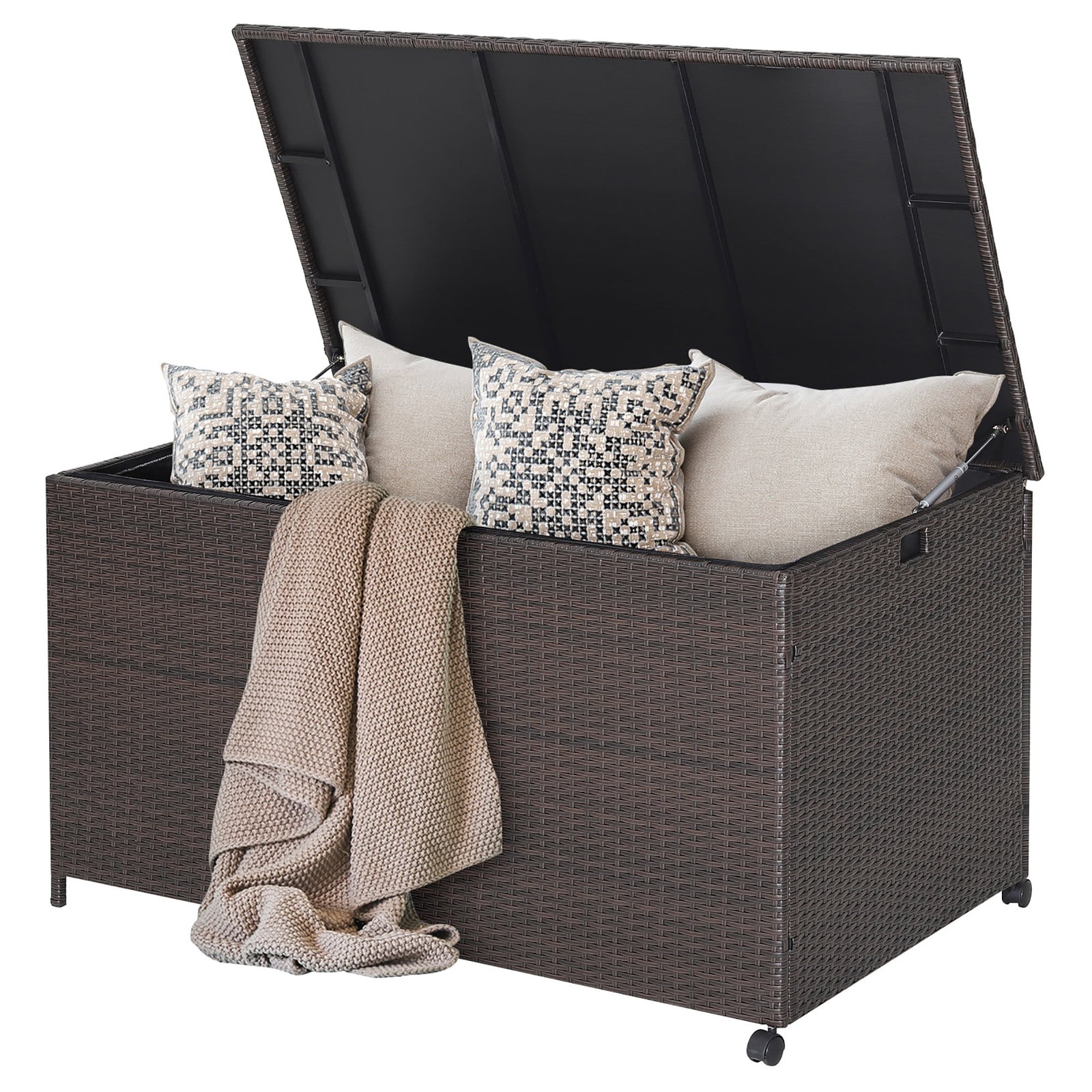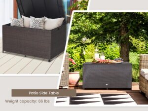 This 133 gallon outdoor PE rattan storage box will be a perfect choice to store and protect your items! When you open the lid,the pneumatic rod ensures safety so that your kids can open it as well. What’s more,the inner capacity is 133 gallon to provide sufficient space to store cushions,pillows,tools and sports equipment,keeping your outdoor space tidy and clean. In addition,the zippered liner with PU coating is waterproof,which prevents your items from raining. For long lasting use,we suggest you do not leave it outside on raining days. When you close the lid,this storage bin can be used as a side table for great convenience.