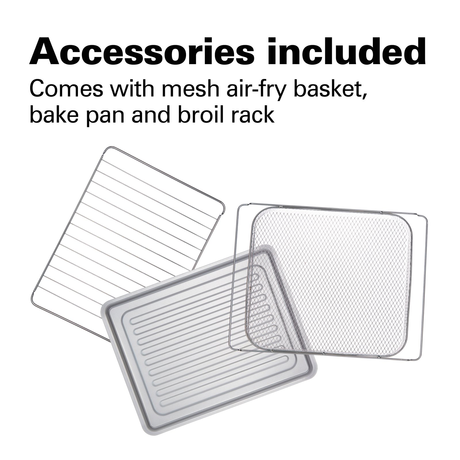 - INCLUDES METAL MESH BASKET FOR AIR FRYING, BAKE PAN, BROIL RACK AND 2 RACK POSITIONS. The air fry oven comes with everything you need to start cooking right away.