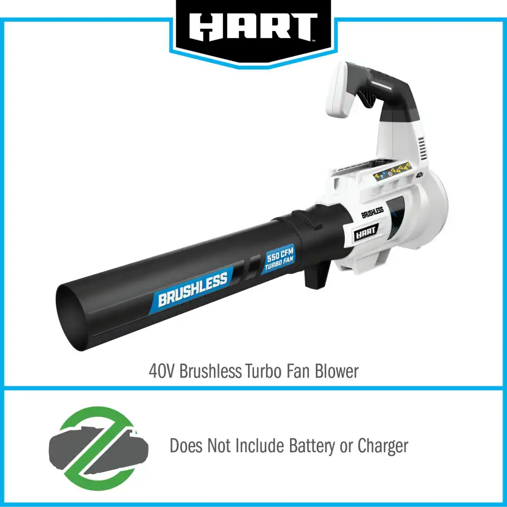 Rely on our Brushless Turbo Fan Blower to clear your yard quickly and efficiently! With 550 CFM and 125 MPH, this blower delivers unmatched power. The Turbo Fan design directs air from the back of the tool and out the front with absolutely no disruptions, guaranteeing maximum power. Integrated ultra-quiet offers our quietest blower. Users have ultimate control with both a variable speed trigger and turbo button. The variable speed trigger customizes the output of air while the turbo button ensures that even the heaviest of leaves can be cleared. Lastly, the high-performance Brushless Motor Technology provides more power, longer runtime and longer motor life. The HART 40V Battery (Not Included) is compatible with all HART 40V tools. All a part of the 40V System where you get ALL POWER, NO GAS.