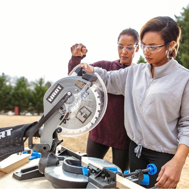 Compact and lightweight, The HART 7-1/4-inch Compound Miter Saw is a great addition to your collection. It has up to 2-inchx4-inch cut capacity with 4-1/4-inch max crosscut. It features an adjustable bevel from 0° – 45° with adjustable positive stops at the most common angles (0°, 15°, 22.5°, 31.6°, and 45°) left and right for quick cut settings and a trigger lockout for increased safety. The partial sliding fence provides better material support during application. Includes (1) 7-1/4-inch compound corded miter saw,24T carbide tipped saw blade, a blade wrench, a dust bag and a work clamp.