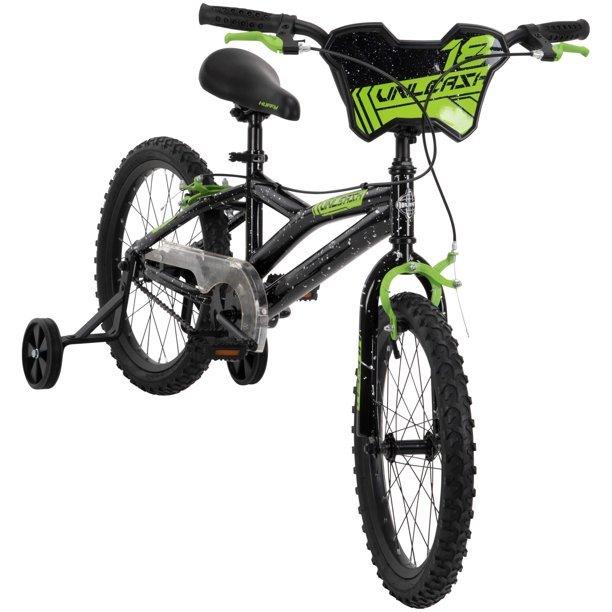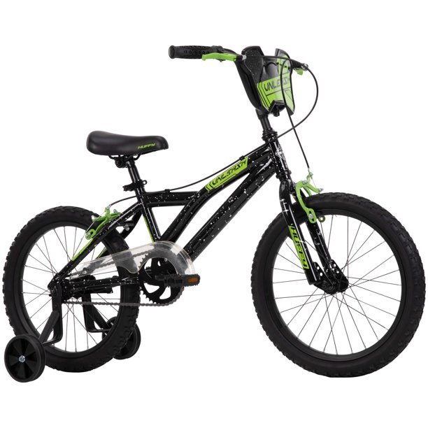 18″ Unleash Boys’ Bike with Handbrakes This Unleash 18-inch Bike by Huffy features a sleek style. The durable steel frame is decorated with crackle black colors and features striking neon green accents. Matte black wheel rims provide a cool style. The handlebar plaque completes the overall look. This bike is fun to ride, and has great features, too! This single-speed bike comes with easy-to-use handbrakes. Plus, the wide training wheels are removable. Such a great combination for learning to ride. An alloy quick-release lever that makes it easy to adjust the seat to the right height. This seat is padded to make sure every ride is comfortable. Cool racing fun, inspired by this bike’s graphics, is just what your child wants, and Huffy’s Unleash bike is ready to make memories. Get ready for your child to deliver that winning smile! From Huffy, We Make Fun.