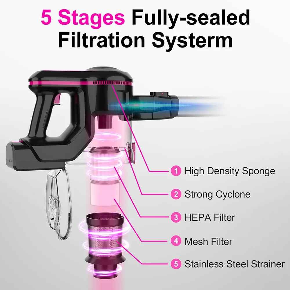 - 5 Stages High-efficiency Filtration–With 5 stages fully sealed cyclone filtration system, the vacuum cleaner cordless captures 99.99% of fine particles as small as 0.1um and offers powerful centrifugal force to efficiently separate dirt. This rechargeable vacuum cordless provides the ultimate purified air and an excellent cleaning experience for every user.