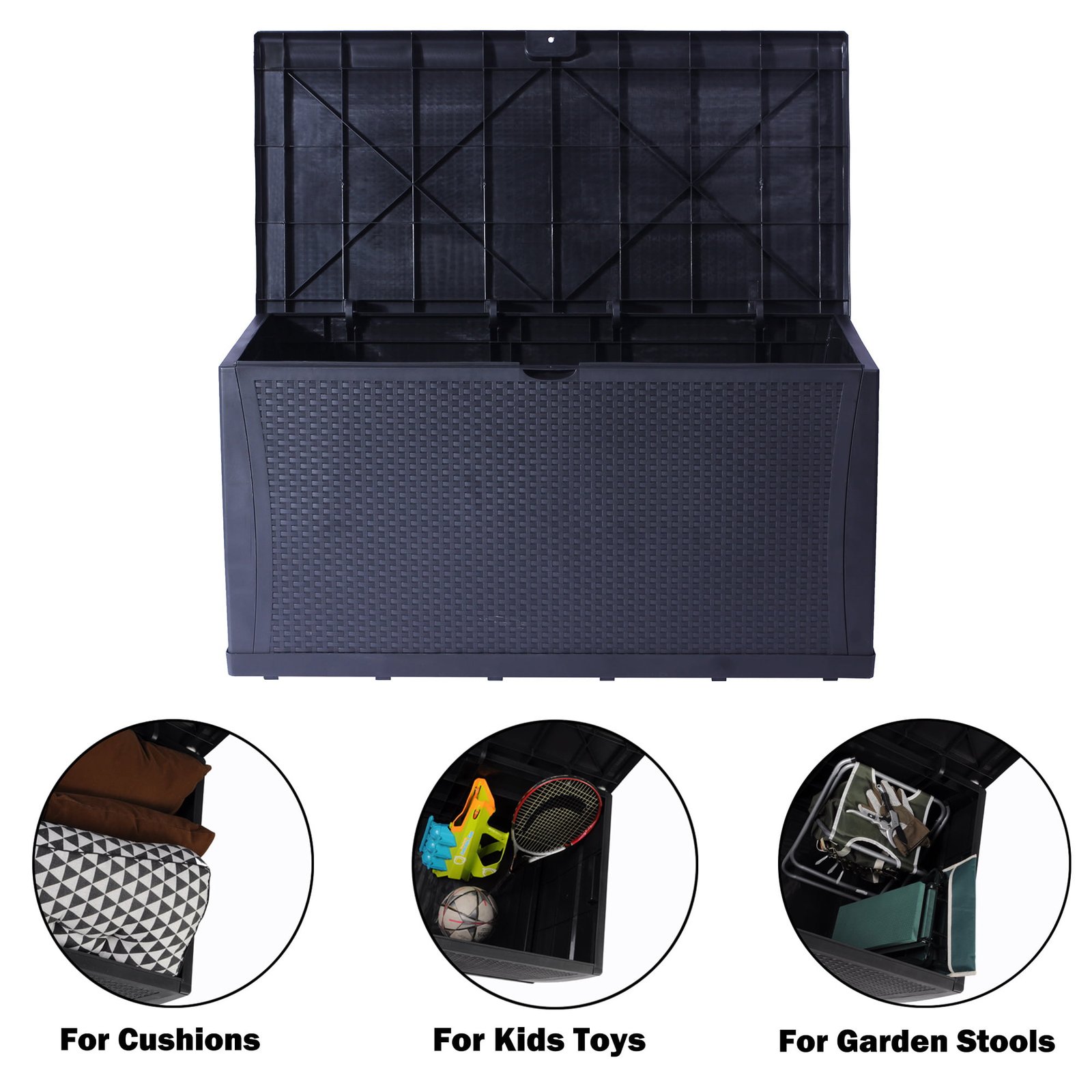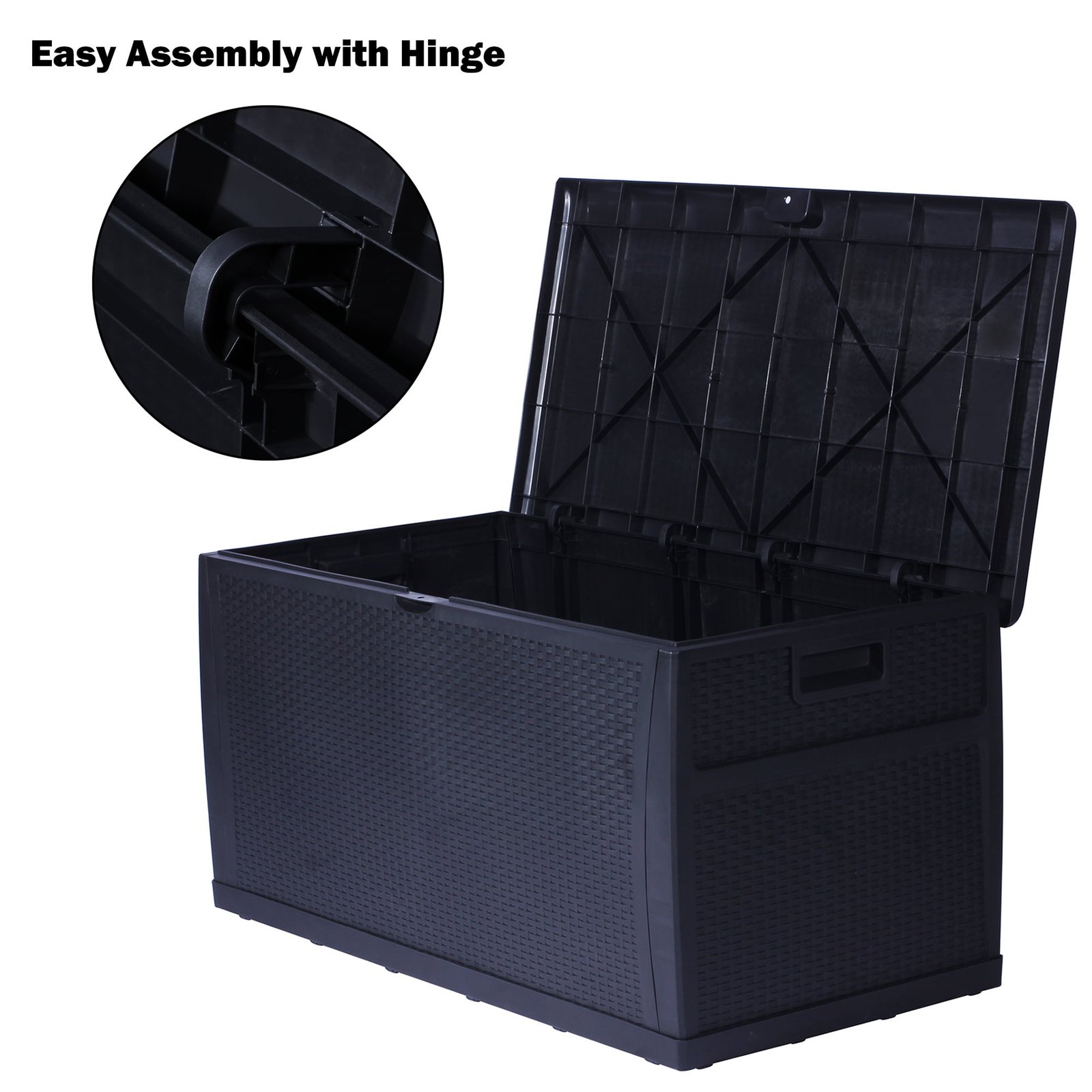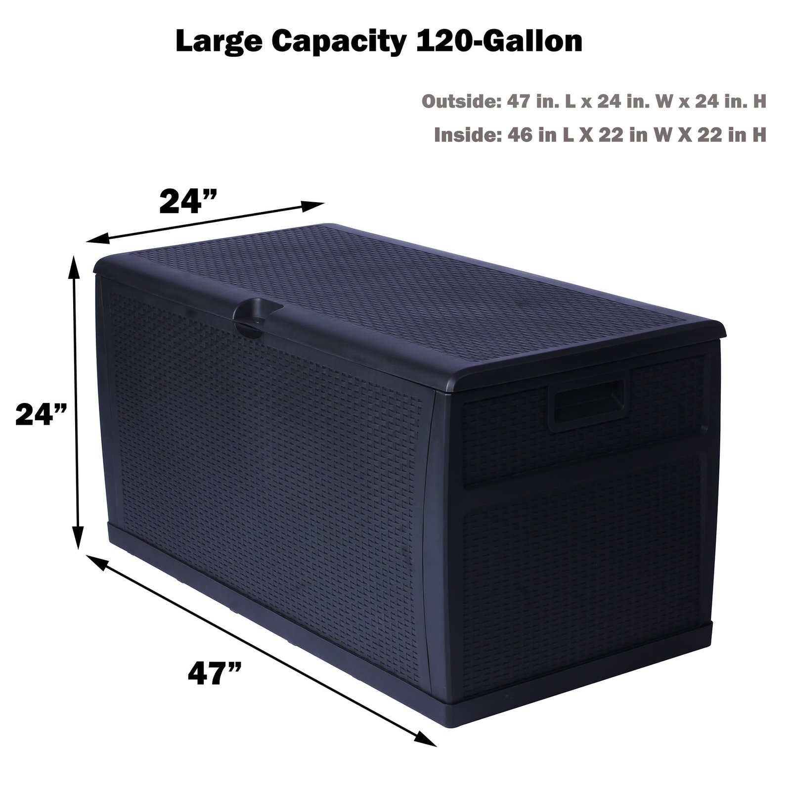 Karmas Product Deck Storage Box is oversized with a 120-gallon storage capacity. With rattan finish, it blends perfectly with most modern patio decor and furniture. The outdoor deck box, made with high-quality plastic, is durable and sturdy enough to withstand bad weather conditions. You can put summer cushions, pillows, and big toys inside with confidence. Quick Assembly, No tools required. To attach the front to the side first, then the bottom panel. Inside, 46 in L X 22 in W X 22 in H. Large Capacity 120-Gallon perfectly store summer cushions, kids toys, garden supplies, odds, and ends. Weather-Resistant Design keeps inner dry, Handles on sides for easy movement. The Flat Lid provides a spacious bench surface for food serving and is sturdy enough for one adult seating. Plastic-Made Rattan Finish matches well with most patio furniture and decor, fashionable and functional.