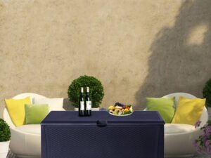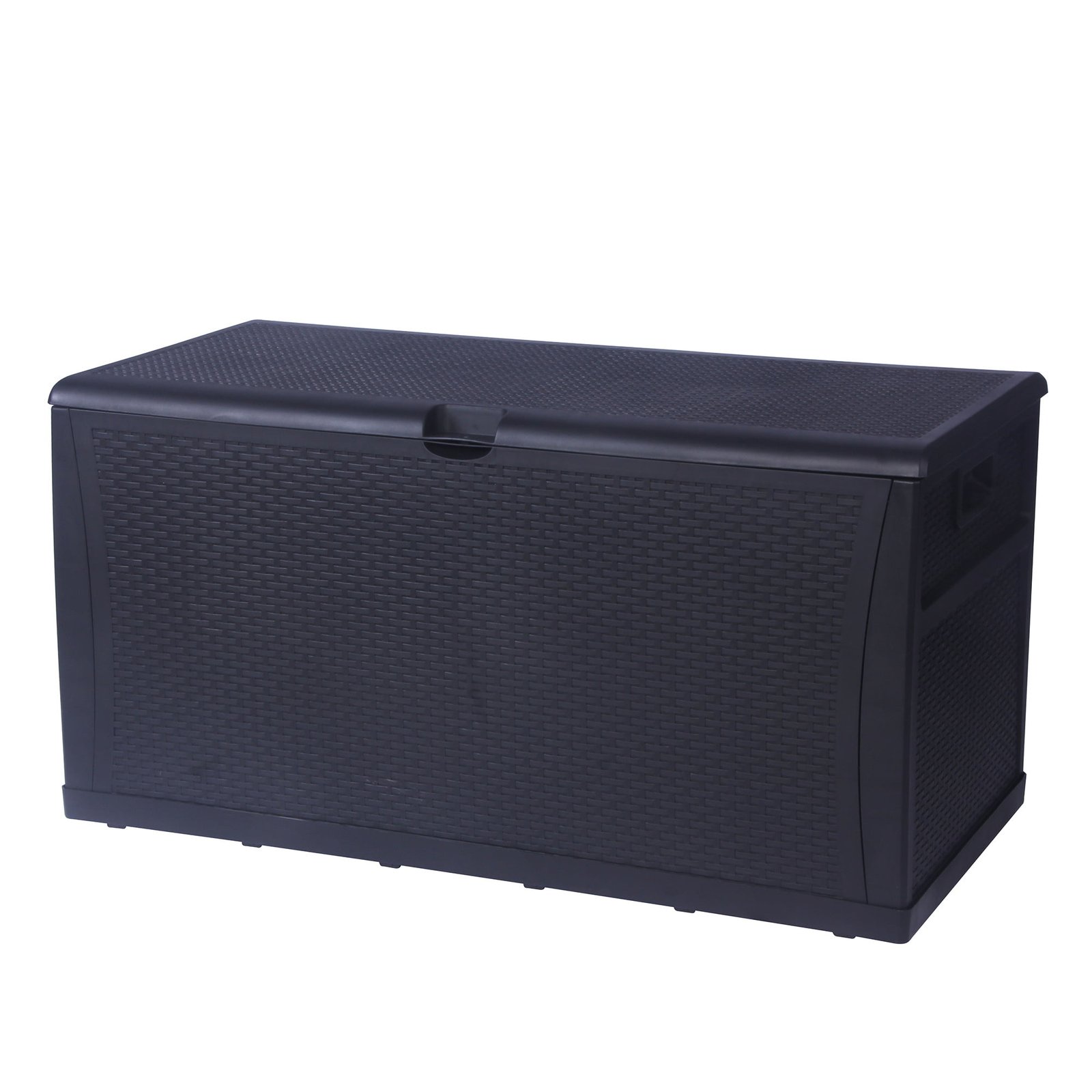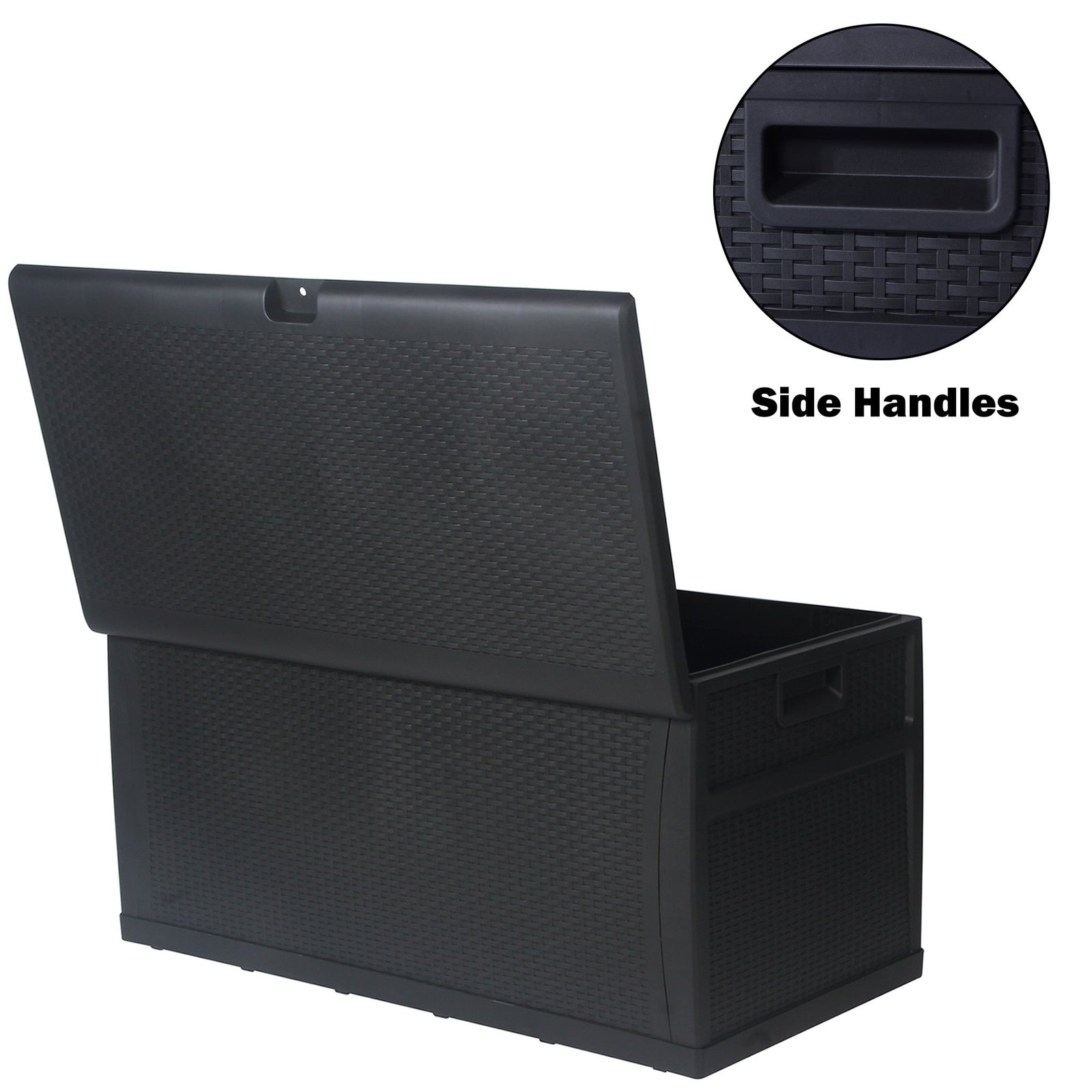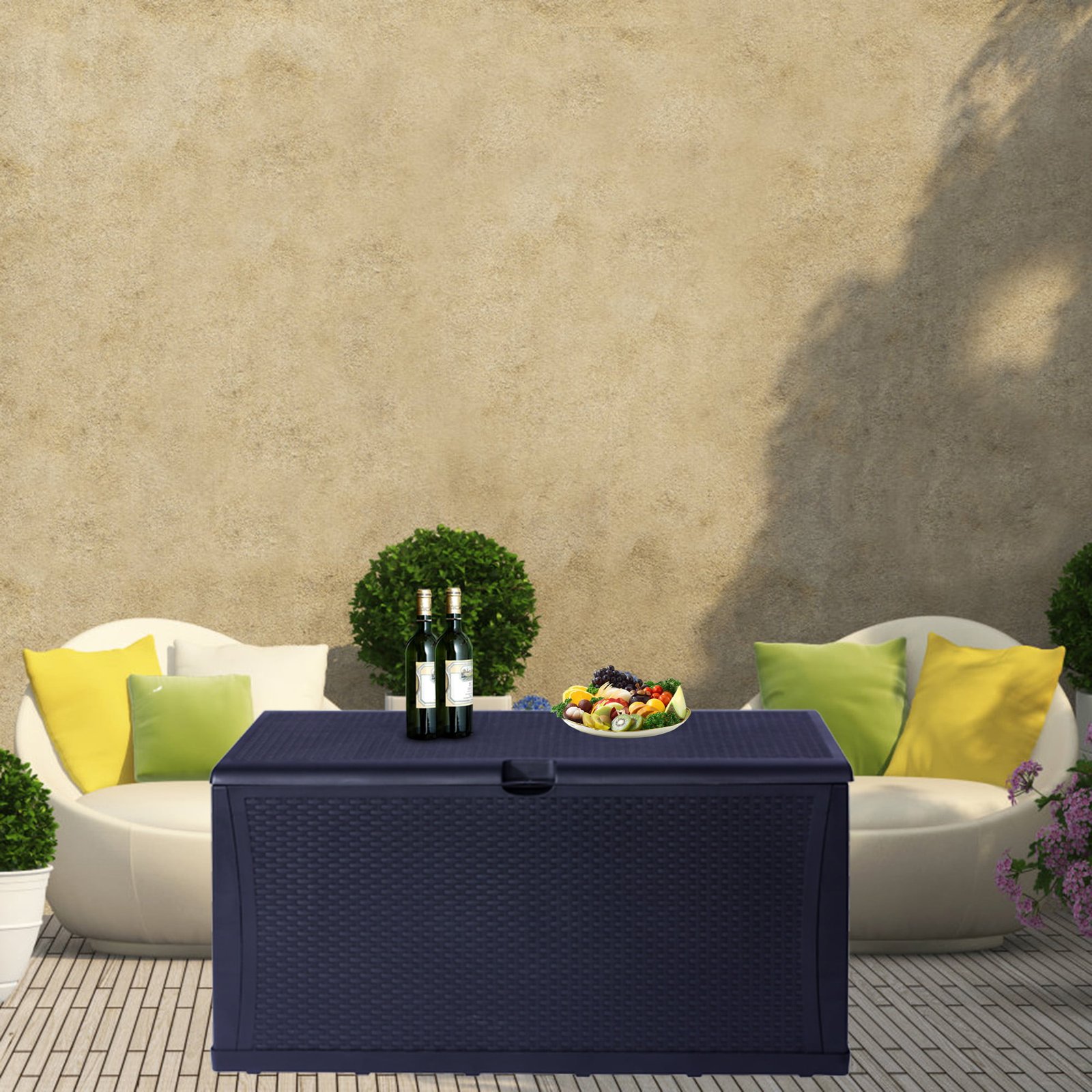 Karmas Product Deck Storage Box is oversized with a 120-gallon storage capacity. With rattan finish, it blends perfectly with most modern patio decor and furniture. The outdoor deck box, made with high-quality plastic, is durable and sturdy enough to withstand bad weather conditions. You can put summer cushions, pillows, and big toys inside with confidence. Quick Assembly, No tools required. To attach the front to the side first, then the bottom panel. Inside, 46 in L X 22 in W X 22 in H. Large Capacity 120-Gallon perfectly store summer cushions, kids toys, garden supplies, odds, and ends. Weather-Resistant Design keeps inner dry, Handles on sides for easy movement. The Flat Lid provides a spacious bench surface for food serving and is sturdy enough for one adult seating. Plastic-Made Rattan Finish matches well with most patio furniture and decor, fashionable and functional.