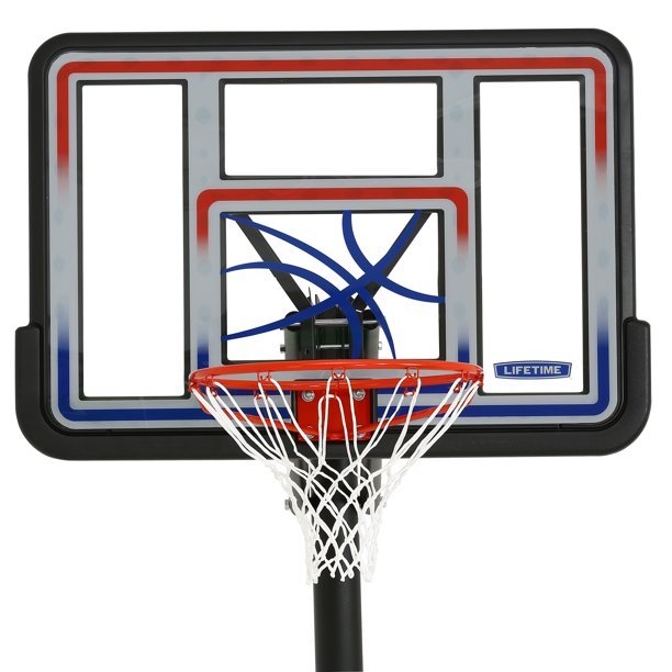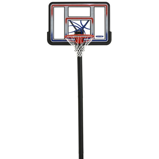 “Lifetime In-Ground Basketball System – Features a 44 in. x 30 in. x 2 in. Shatterproof Fusion® Backboard, Quick Adjust® II, 3.5 in. round pole – 3 piece (black), and a Classic Rim (black). 3-Piece Powder-Coated Steel Round Pole. Acrylic Fusion™ Backboard All-Weather Net Classic Rim Fade-Resistant Graphics Quick Adjust® II Adjustment”. Raise or lower the rim height from 8 to 10 feet using a broomstick. Now players of any age or skill can enjoy the game at their level