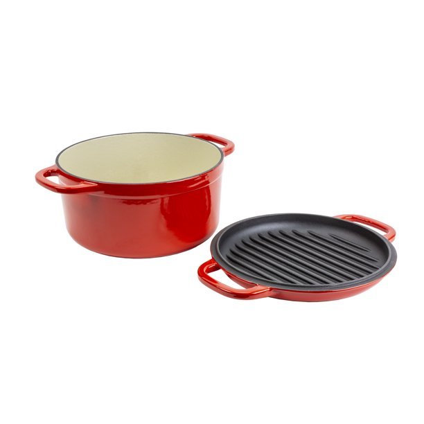 - As the right tool to marinate, refrigerate, cook, and display as a beautiful serving dish, it offers an abundance of possibilities. Includes one Lodge 7 Quart Red Enameled Cast Iron Double Dutch Oven with Grill Lid.