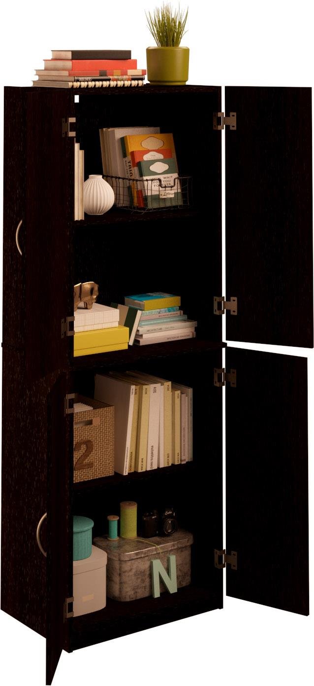 - 4-door storage cabinet is available in multiple colors including Black Forrest, Northfield Alder and White Stipple