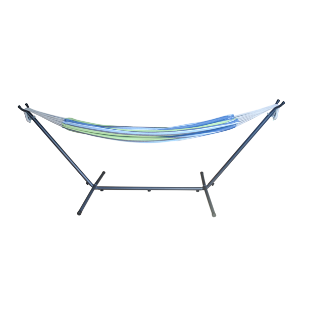 The sturdy hammock allows for optimum comfort and support when you are trying to take it easy in the backyard or on the porch. The stand is super durable and allows for gentle swaying of the hammock so you can spend more of your time relaxing. This double hammock swing and space-saving stand can be quickly set up and is easy to relocate. It has adjustable height options so you can choose your perfect position. The main body of hammock is polyester cotton, comfortable and breathable. High density fabric is soft and durable. The metal knot can prevent the long-term friction and prolong the service life of the hammock. The ropes tightly braided and fixed, which greatly increases the load bearing coefficient, even tension. It comes with two portable & easy to store carrying bags for easy travel. The Mainstays Blue Striped Hammock with Metal Stand can comfortably supports 2 adults and holds up to 450Lbs.