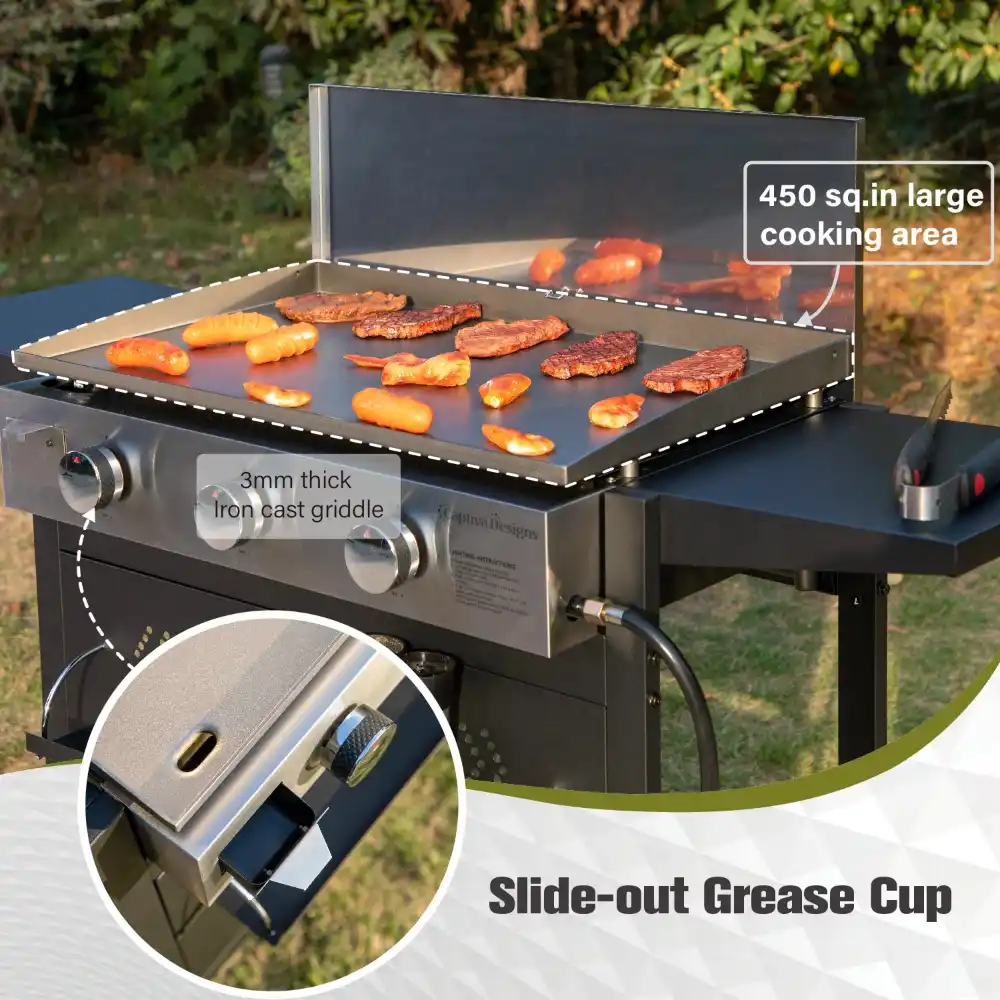 - 【FUNCTIONAL DESIGNS】There are both hot area and warm area on this griddle. The hot area is for cooking and even searing food while the cold area is for warming food. Besides, there are 2 side tables that offer more placing space. These thoughtful details make the griddle is a perfect outdoor kitchen cookstove.
