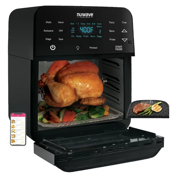- Everything You Need: Every 15.5qt Brio includes mesh racks, Grill plate, drip tray, integrated temperature probe, rotisserie kit, a 70 recipe book, 100 pre-programmed presents, NuWave Cooking Club app, You even get the all-new non-stick Grill Plate