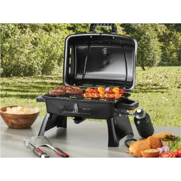 Ozark Trail Portable Table Top Camp Stove. This tabletop grill is perfect for camping, taking on a picnic, storing and bringing along in your RV, and fits perfect on your apartment or condo balcony. The grill operates using a 1lb liquid propane gas cylinder. The legs fold in to create more space for storage. There are two sturdy handles on each end and a clip that will hold the hood in place during transportation. The temperature gauge on the hood ensures you cook your food with precision heat. The push piezo ignition makes it easy to get your grill lit and ready to cook delicious food. Included is an enameled steel cooking grid as well as a full cast iron griddle. Having both types of cooking surfaces is like having two grills in one.If you have ANY comments, concerns or questions please call us at 855-200-8445