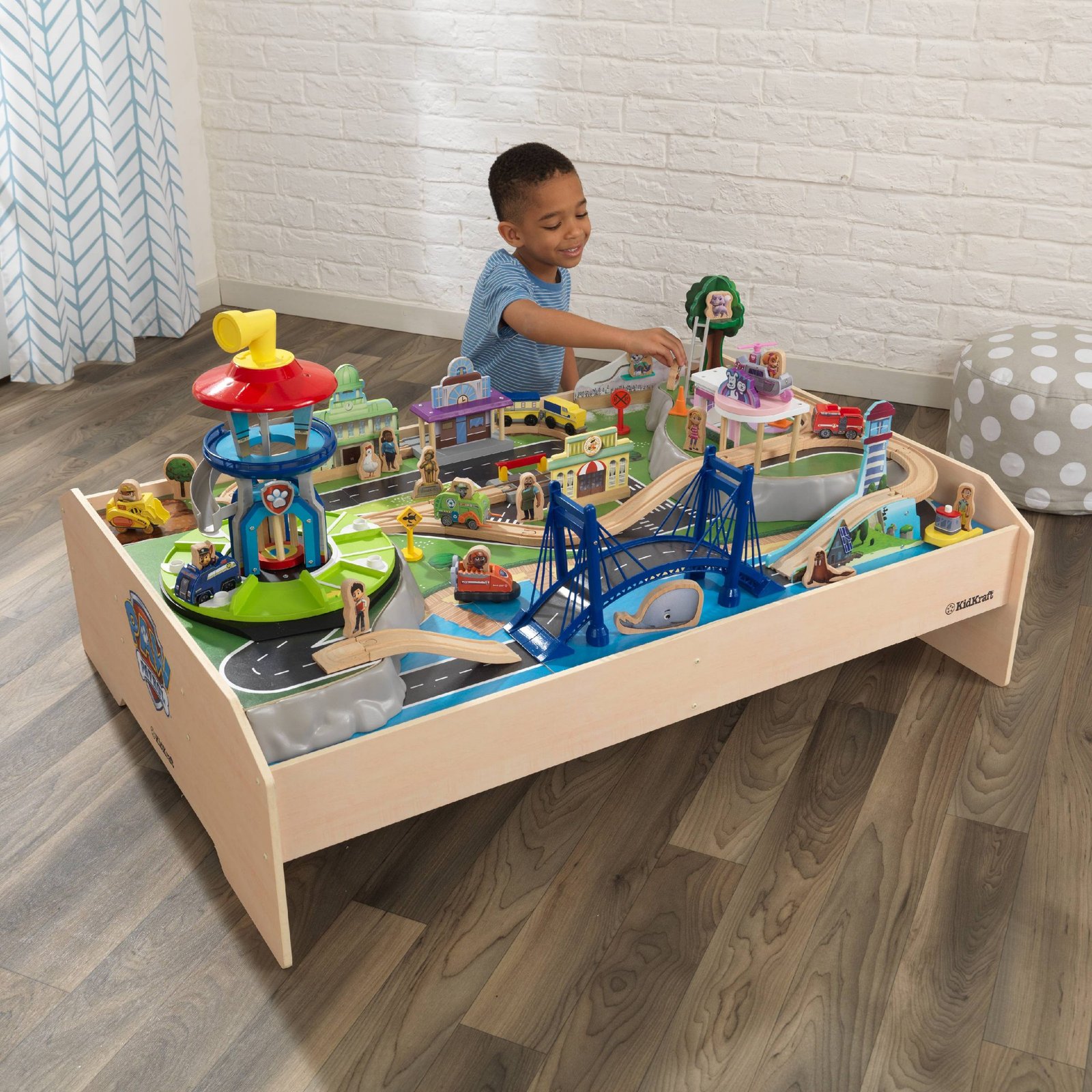 Join Ryder, Chase and all their friends as they race to the rescue through the familiar sights of PAW Patrol Adventure Bay Play Table by KidKraft. The Lookout Tower features a working slide, elevator, rotating periscope and rotating base, just like the show. Each PAW Patrol member is included, with a total of more than 70 pieces. The play table’s sturdy construction can handle even the most enthusiastic imaginations as kids build and rebuild Adventure Bay the way they want. Two movable plateaus and interchangeable tracks create endless combinations with KidKraft’s other train sets.