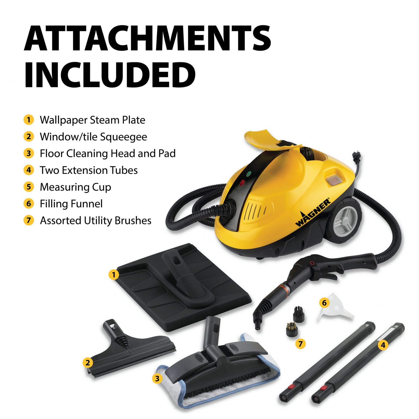 The Wagner 915 On-Demand Power Steamer is a pressurized system that supplies steam at the touch of a button. This multipurpose home cleaner steam cleans surfaces in one step without chemicals. It can be used to clean a wide variety of household surfaces, including kitchen countertops, sinks, toilets, showers, floors, appliances and more. It can also be used to clean outdoor surfaces like outdoor patio furniture and cushions. The included wallpaper plate is ideal for quickly and easily removing old wallpaper using nothing but high temperature steam. Includes a 915 Power Steamer, steam plate, jet nozzle, two brushes, two extension wands, window squeegee, large cleaning brush, cleaning brush towel, and funnel measuring cup.