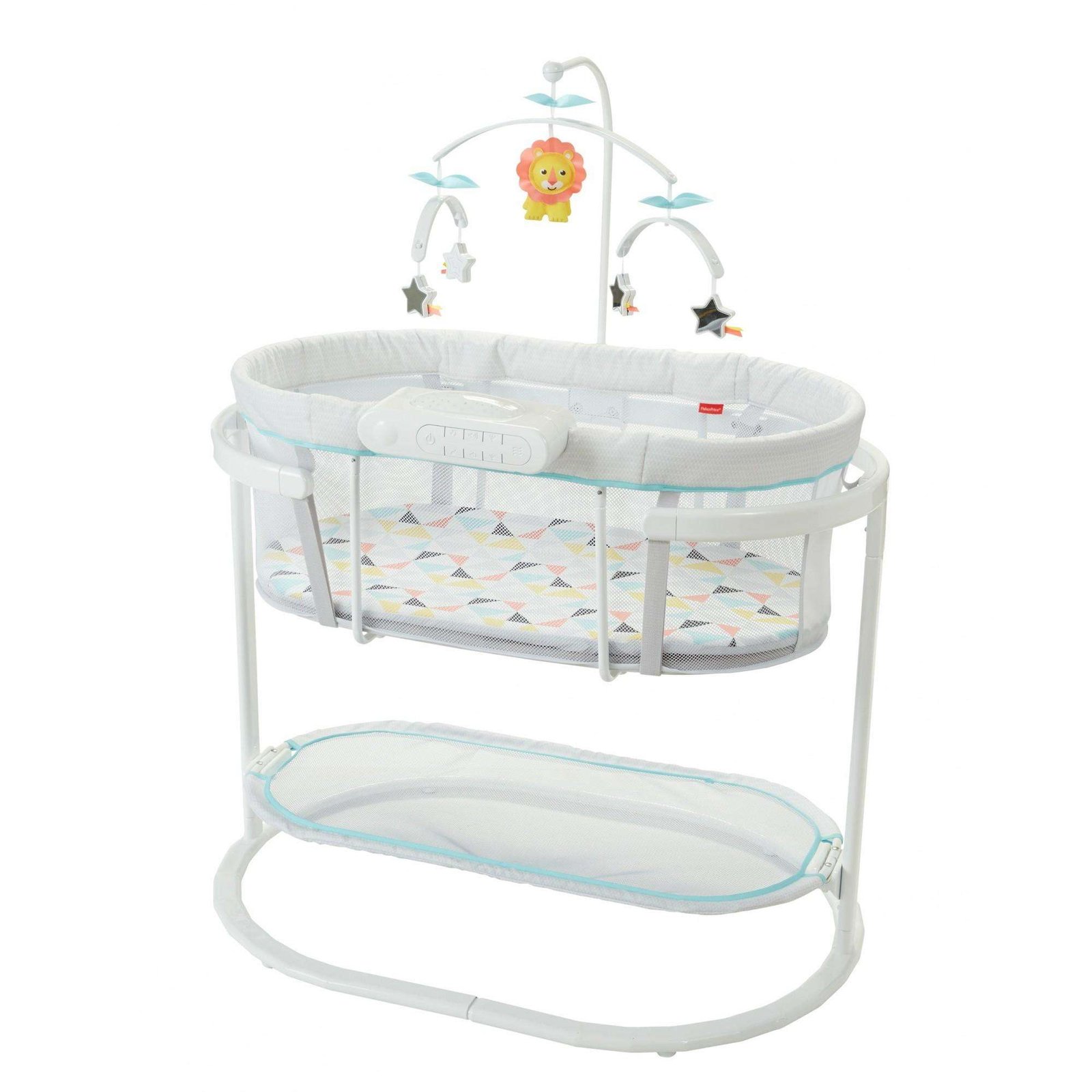 From soothing sways, music and sounds to calming vibrations, light projection and more, this bassinet has everything to help little ones drift off to dreamland in comfort. As babies relax on the comfy sleeping pad, they can look up at the mesmerizing overhead mobile withstars while they gently sway. Or, turn on one of the captivating light features, like the overhead projection.Youcan alsoremove theprojectorfrom the bassinet and use it as a tabletop soother! And, there’sa convenient night light setting for an added sense of security.For extra coziness, turn on the calming vibrations and serene songs or sounds. (Ahhh, that’s nice…)Getting a good night’s sleep sometimes can be a challenge, but it’s super important for baby’s brain development. With the Fisher-Price Soothing Motions Bassinet, you’ll be ready to help your little one soothe and snooze night after night! (So comfy, so cozy, so Zzzzz) Where development comes into play Sensory: A variety of soft textures, calming vibrations, and swaying motion stimulate baby’s senses. Security & Happiness: Soft padding, calming vibrations, and gentle swaying help soothe baby and become part of the nap and bedtime routine, giving baby a sense of security.