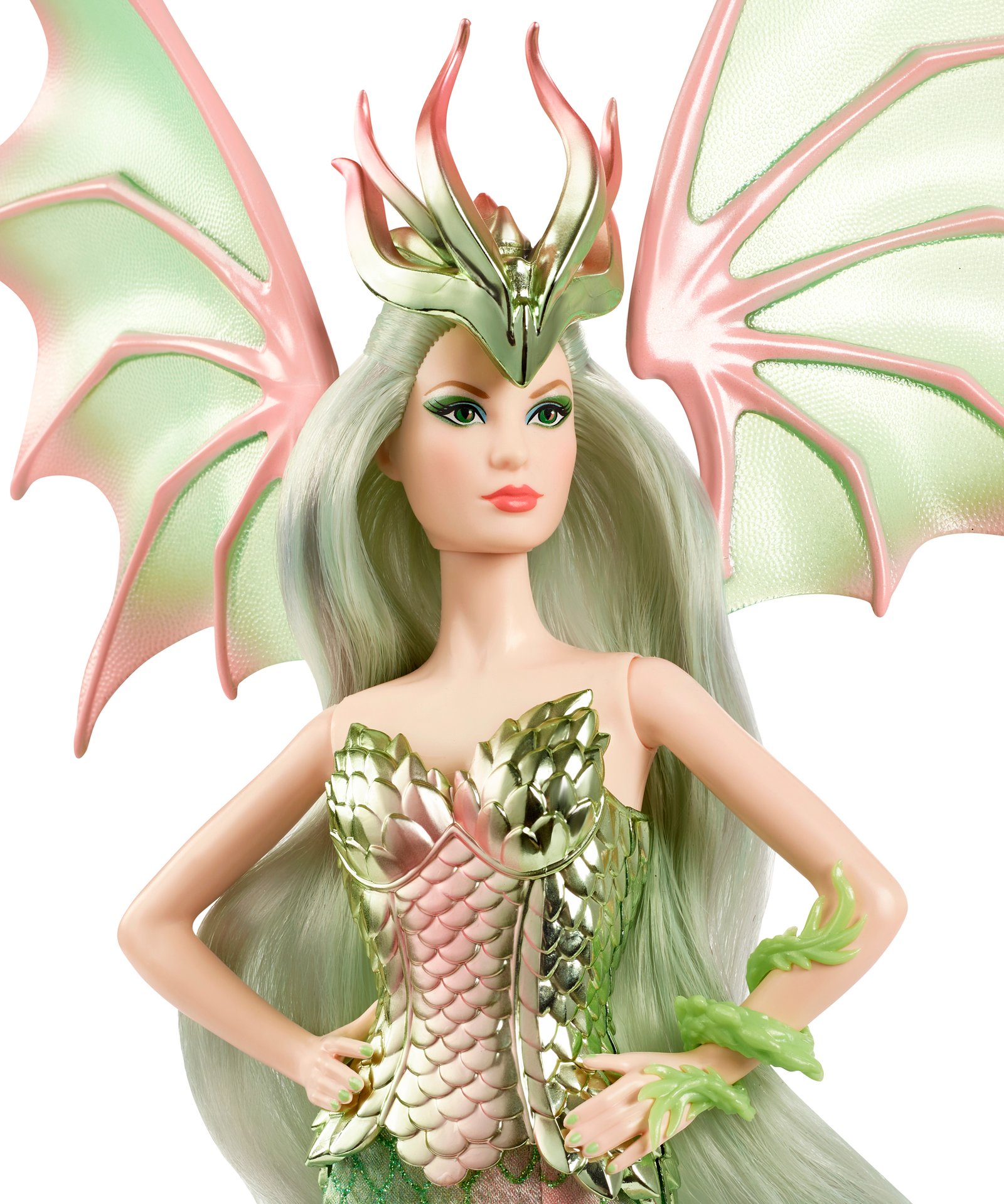 Behold the third and final doll to enchant the Barbie Mythical Muse Series. Dragon Empress Barbie doll is a bold, statuesque beauty with a dramatic wingspan. She wears a scale-detailed bodice in metallic mint-green and pink ombre. Beneath it is a glittered, scale-printed skirt with a slit that reveals her pearlescent, heroic heels. Her headpiece, in matching pastel ombre hues, crowns her cascading fantastical hair. A dragon-inspired cuff coils her arm, completing the look. Poised to take flight to a distant land, Dragon Empress Barbie doll makes the perfect gift for collectors and fantasy lovers. Includes doll stand and Certificate of Authenticity. Gold Label Collection. Doll cannot stand alone. Colors and decorations may vary.