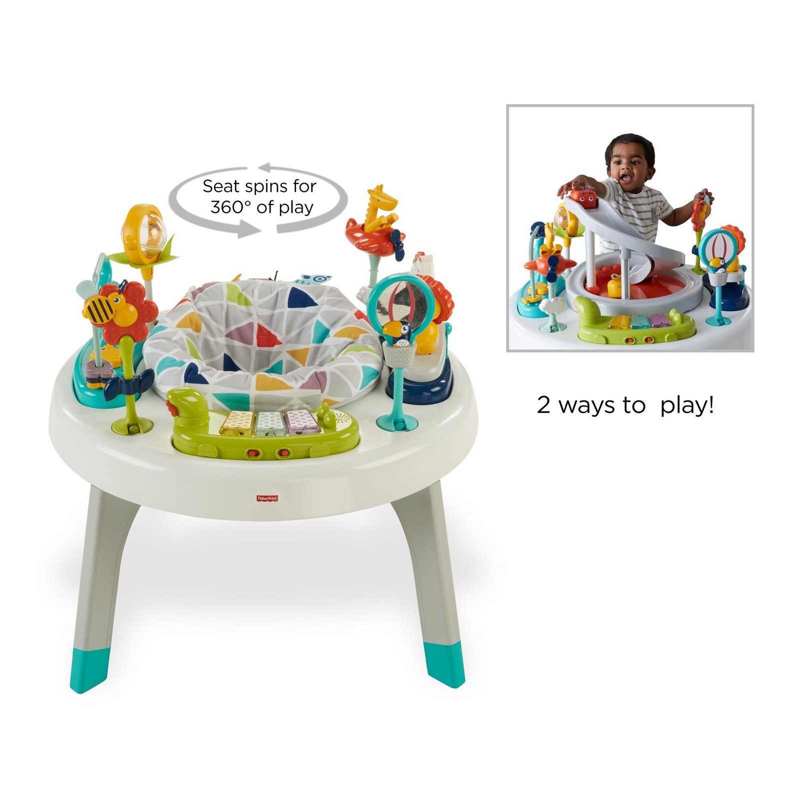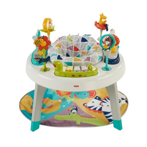 From tummy time, to sitting and spinning, to standing and exploring all around–this 3-in-1, animal-themed activity center will keep your little monkey busy as can be! The soft play mat and musical alligator are perfect for teeny ones to lay and play, while the fabric seat allows older babies to spin around and discover all 360 degrees of exciting toys and activities. And with an add-on ramp with shape-sorter bugs to send sliding down, toddlers can keep the good times rolling! Where development comes into play, Gross Motor: Little muscles get a big workout as they go from sitting and reaching & interacting with the activities to pulling up to a stand and cruising around the table. Sensory: Bright, cheery colors and playful lights and sounds engage your baby’s developing senses. Curiosity: As little ones explore the variety of activities, from making music with the alligator to rolling the bugs down the ramp, they’re introduced to cause and effect! Use only with a child who can hold head up unassisted and who is not able to walk or climb out of product.