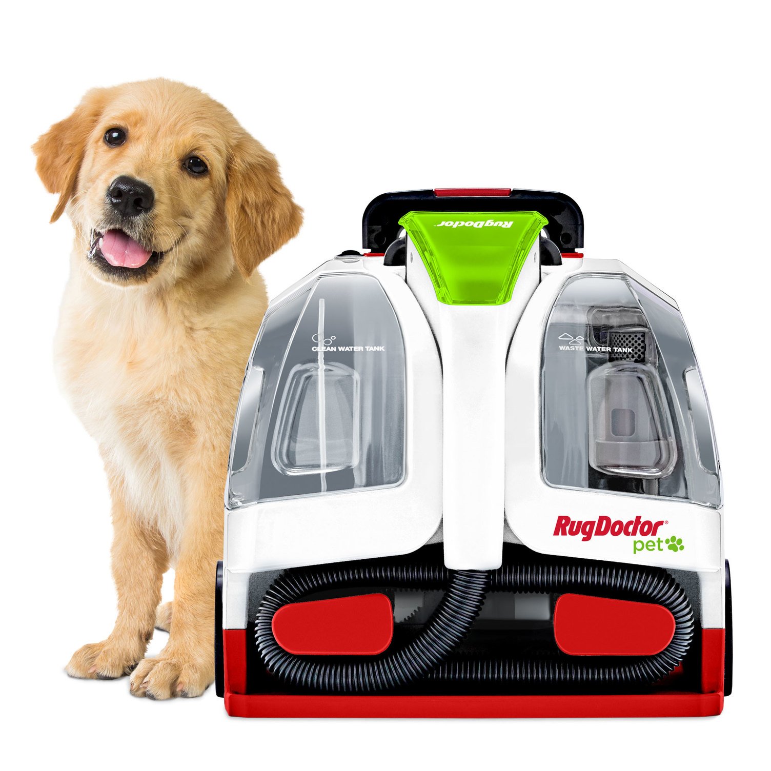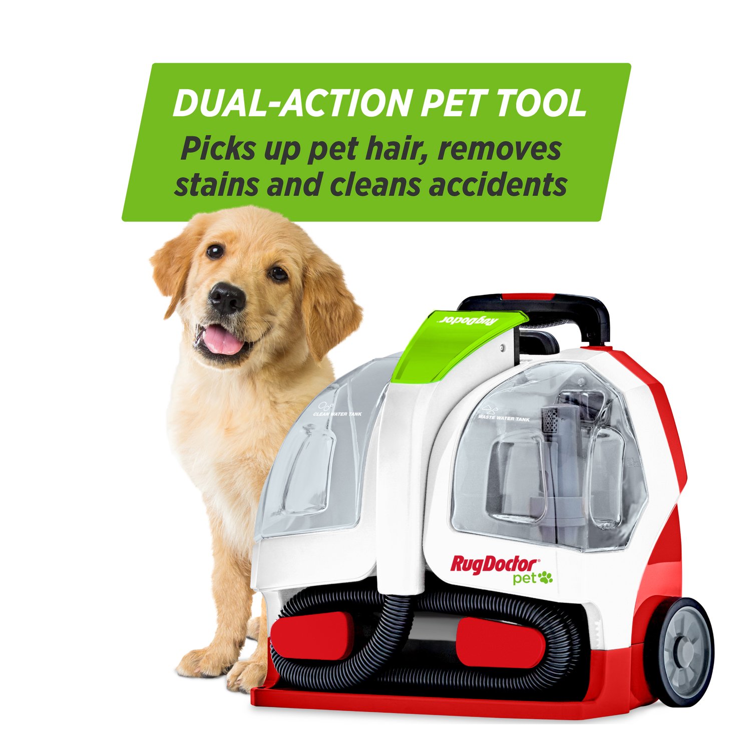 We know your pet is part of the family, but life happens – sometimes they make a mess. That’s where the Rug Doctor Portable Pet Carpet Cleaner comes in. Handy for accidents, pet hair and stains, this spot cleaner is a great immediate fix. The Portable Pet Cleaner is a powerful clean for not only pet messes, but everyday accidents. With twice the suction power compared to leading spot cleaning machines, Rug Doctor Pet Spot Cleaner eliminates embedded dirt, tough stains and odors from pets and kids alike. The handheld dual-action pet tool expertly removes pet hair, as well as tough, set-in spots, stains and odors. Carpet-friendly wheels and retractable handle make it effortless to glide the machine across carpets and stairs for ideal pet-made stain elimination. The professional grade, compact, portable machine works seamlessly on any surfaces, such as carpet, area rugs, stairs, upholstery, pet beds, auto interiors and more. For best results, use with Rug Doctor Pure Power Pet Stain & Odor Solution.