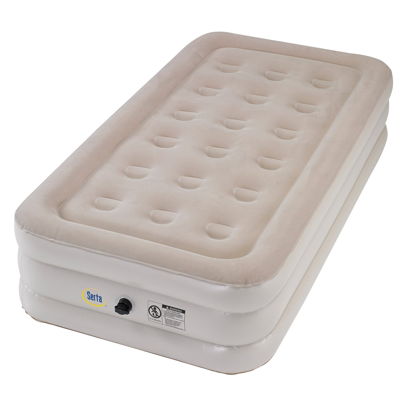 Great for camping, sleepovers, and more! The Serta 16″ air mattress with external AC pump offers amazing comfort as well as quick-and-easy setup so you spend less time fussing over inflation and more time sleeping soundly. This queen-sized air mattress comes with durable PVC and welded coil construction, plus a soft touch suede top to keep your sheets in place. An easy-to-use pump and convenient carry bag are included with your purchase.