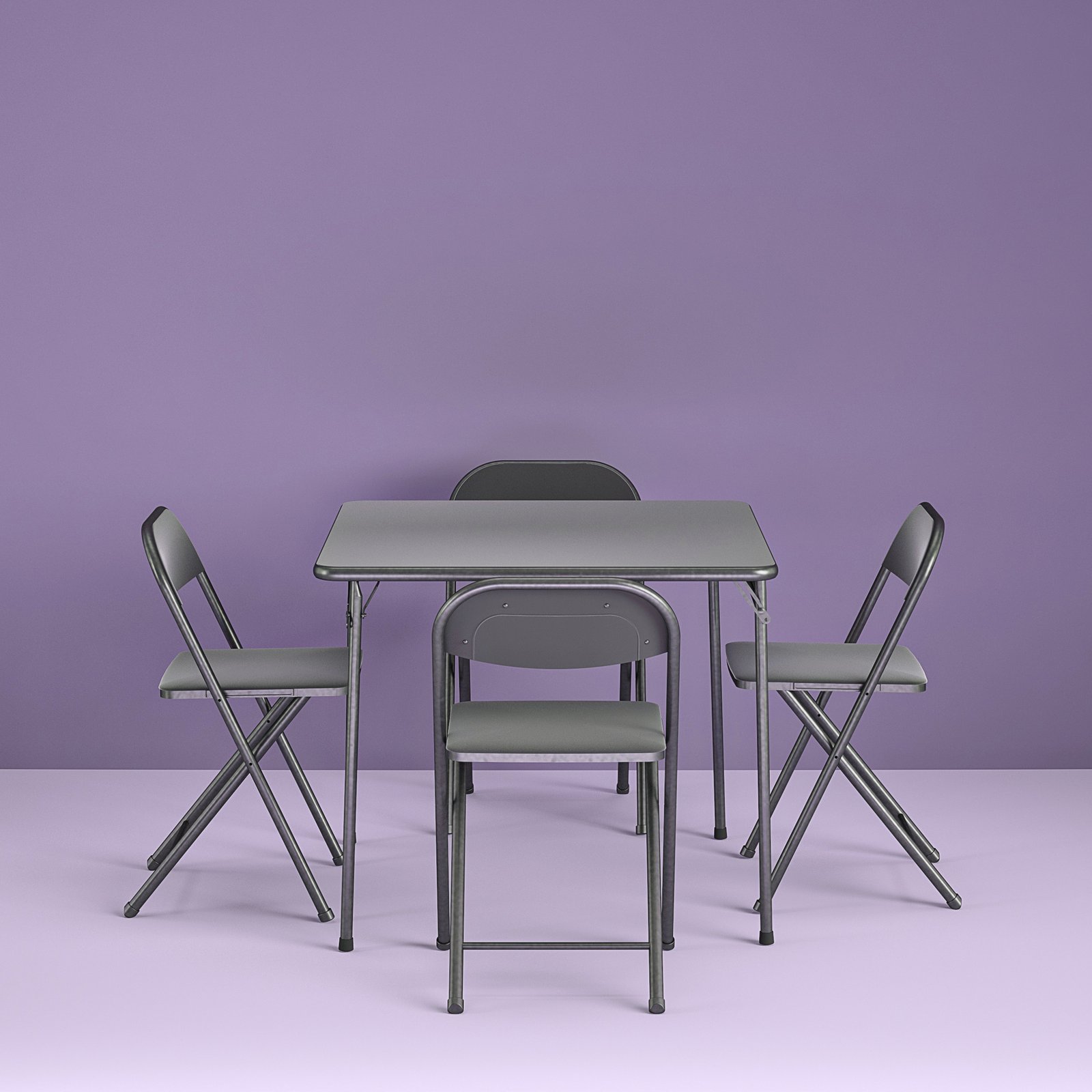 - Cosco 5-Piece Card Table and Chair Set is easy to fold for convenient storage
