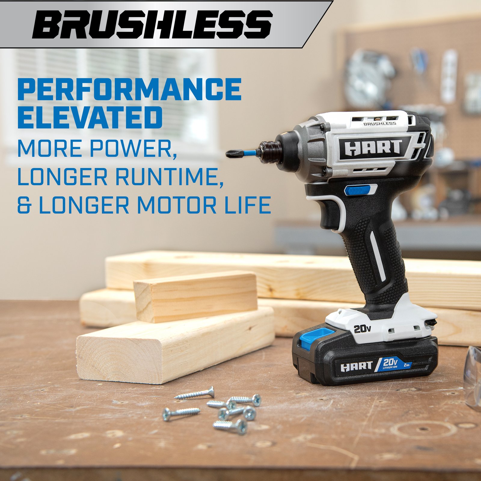Brushless tools delivers up to 30% more strength and is up to 20% faster with The HART Brushless Motor Technology. The brushless motor delivers more strength, longer runtime and longer motor life. The brushless impact driver delivers up to 2200 in.lbs of torque while the variable speed trigger provides up to 3000 RPM for strength and controlled drilling and driving. Other features include a ¼-inch hex chuck for fast and easy bit changes, an LED work light and a belt clip. This tool operates on any HART 20V battery that provides fade-free strength to get you through your project with confidence! This tool only product is compatible with all HART 20V batteries allowing you to continue to grow your HART tool collection without buying more batteries than you need!