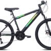 This is a Kent 26″ Northpoint Women’s Mountain Bike in Black with Blue with a hard-tail in the rear and front suspension. This mountain bike also has 21-speed gearing. Some of the other features to call out on this bike is that it has traditional flat pedals, black side wall moderate knobby tires, front disc brakes and rear rim brakes. It also has a quick release seat post for added convenience. This bike has a classic looking paint job that is black with linear accents in shades of blue.