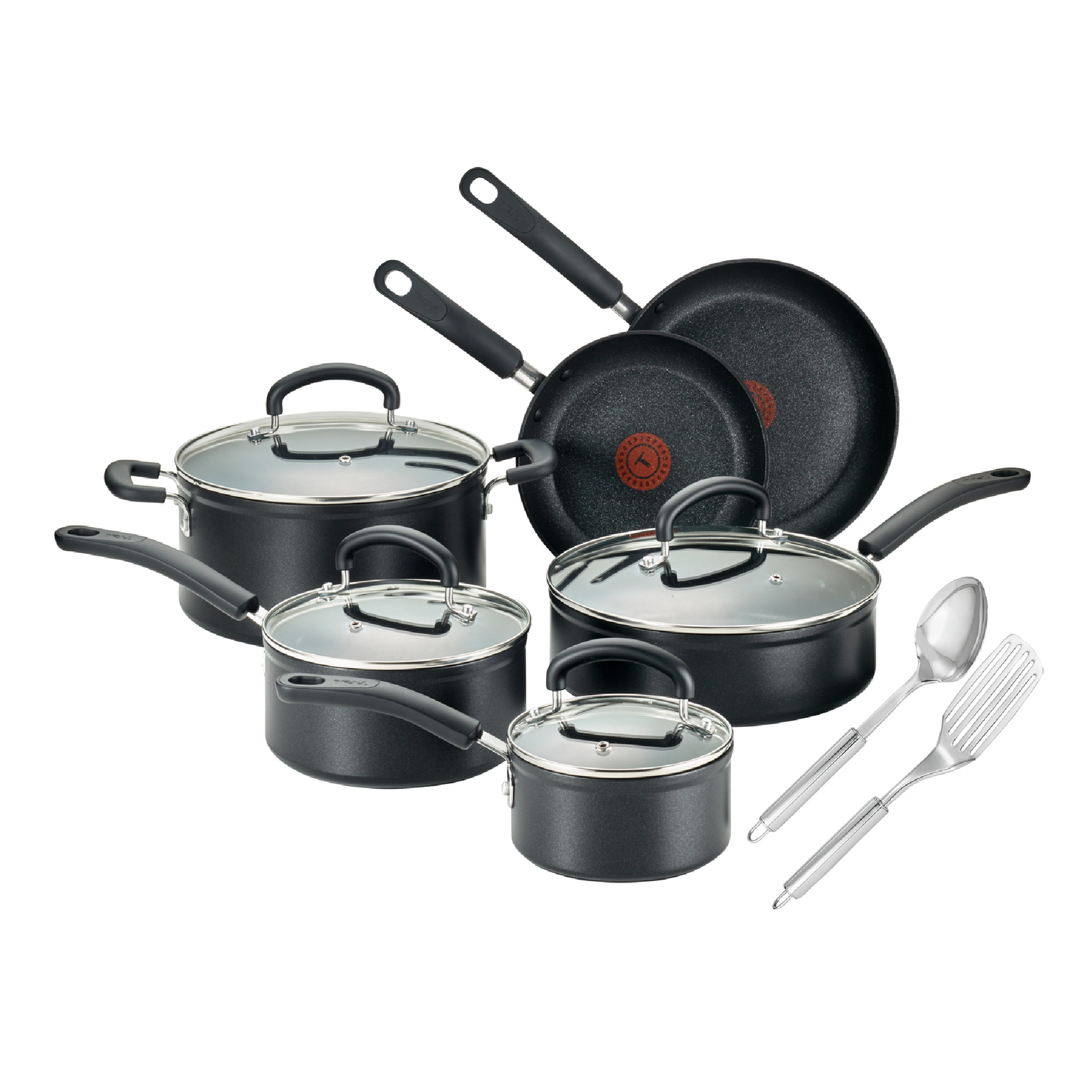 Experience the ultimate durability built to last with T-fal Expert Pro nonstick 12-piece cookware set. Includes 8″ frypan, 9.5″ frypan, 3qt covered deep saute, 5qt covered Dutch oven, 2qt covered saucepan, 1qt covered saucepan, metal spoon and metal spatula. Titanium Advanced nonstick interior stands up to rigorous usage, and the metal utensil safe coating is 2x more scratch resistant*. Thermo-Spot heat indicator shows when T-fal pans are perfectly preheated to start cooking, and the even heat base allows for no hot spots. Features riveted handles and vented tempered glass lids. Dishwasher and oven safe up to 350°F; all cook tops compatibility excluding Induction; limited lifetime warranty. *vs. other T-fal Titanium ranges