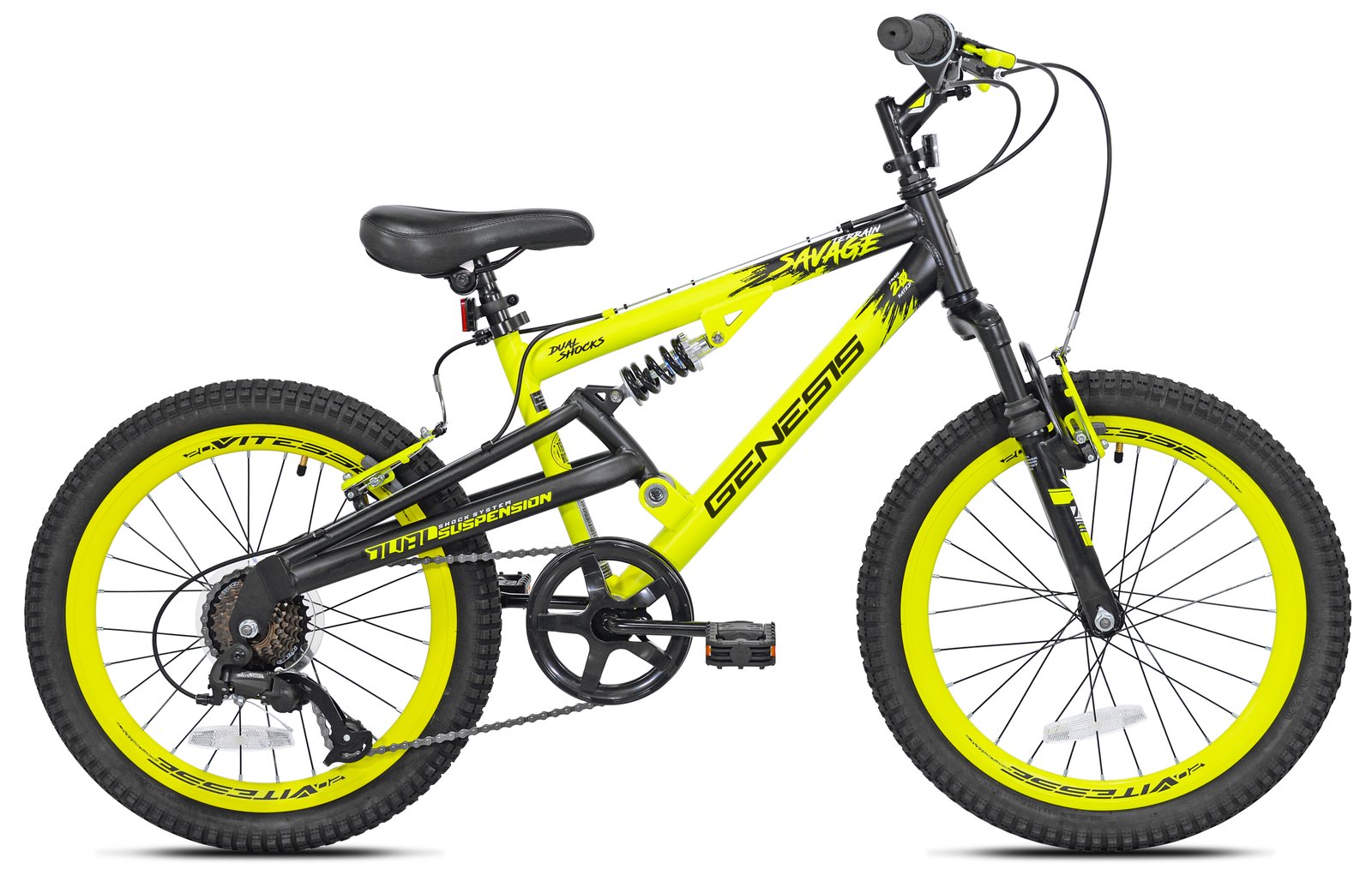 The Genesis Savage 2.0 is a dual suspension mountain bike designed for the younger trail master. It has a sturdy lightweight aluminum frame rolling on high-profile alloy wheels shod with big knobby tires for traction. Shimano provides a 7-speed drivetrain with easy-action twist shifting that helps your child tackle the hills as well as keep up on the flats. Front and rear linear pull handbrakes keep speed under control, and the comfortable padded seat is easily moved with a quick-release height adjustment lever. This is not only a functional mountain bike for trails and roads, it is also a really cool looking yellow bike with black graphics and yellow wheels.