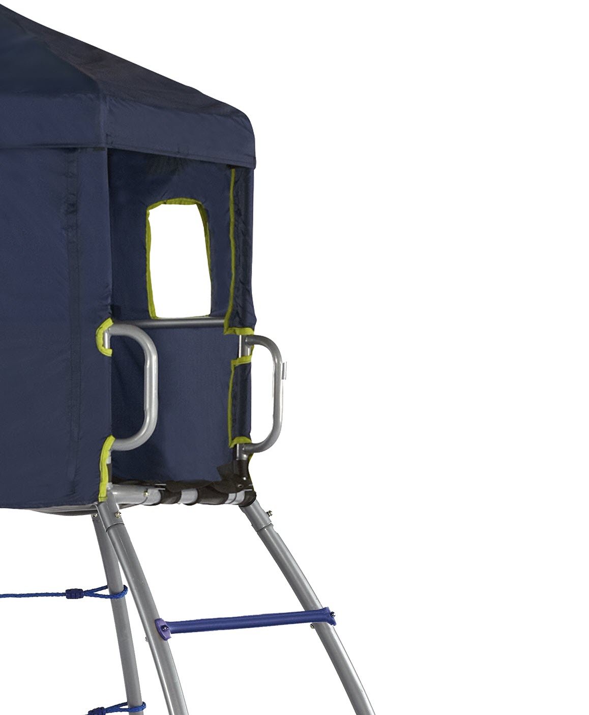 - Features climbing rungs, cargo scramble net, target wall and play platform with fabric roof