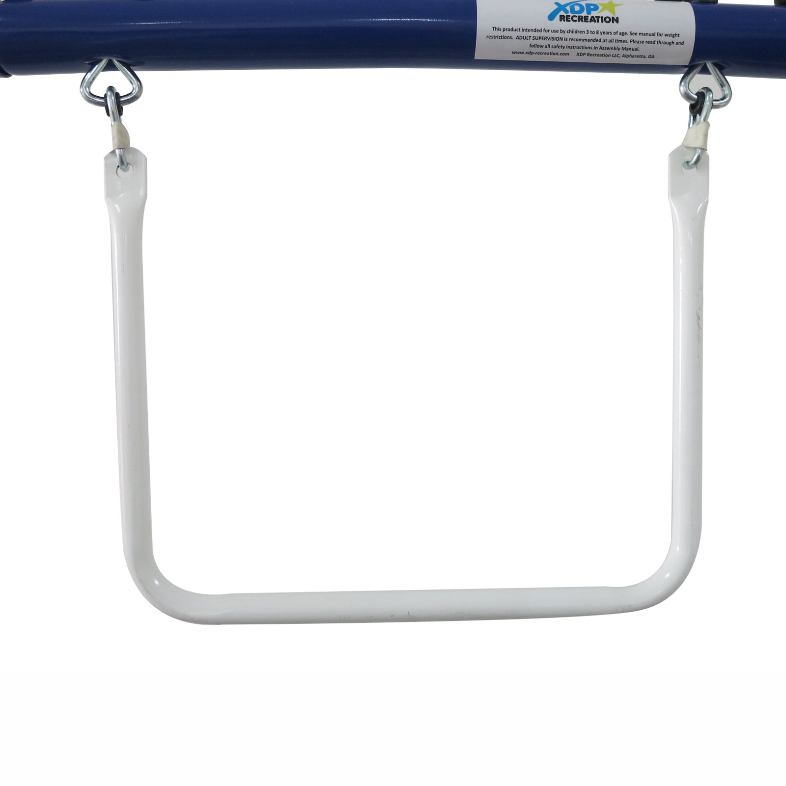 This Swingset is made with a solid frame. We use a steel tubing frame that is powder-coated blue and white. This set includes: