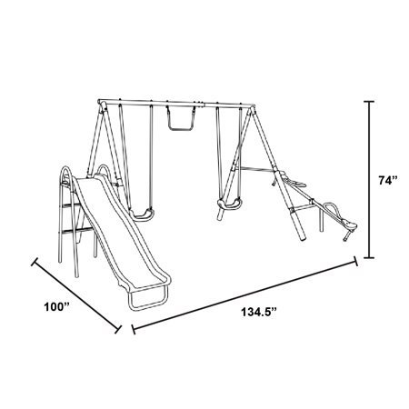 Have fun and stay active with the Super First metal swing set! With two blow-molded swings, a wavy slide, a teeter-totter and metal trapeze, this swing set is sure to become an outdoor favorite with kids. They will be entertained by the different activities this swing set has to offer! Up to 6 kids are able to enjoy this swing set together. They can enjoy swinging on our 2 blow-molded seat swing. All swing set chains are covered with safe and sturdy vinyl to protect little hands while they play. They can also swing and hang off the metal trapeze or race down the durable walled 6-foot blow molded slide. They can also enjoy riding up-and-down in our 2 person teeter-totter. The fun never ends with Super First swing set by Sportspower! All Sportspower products meet or exceed all ASTM safety standards, so kids and parents can both enjoy Super First metal swing set with peace of mind.Product Features: