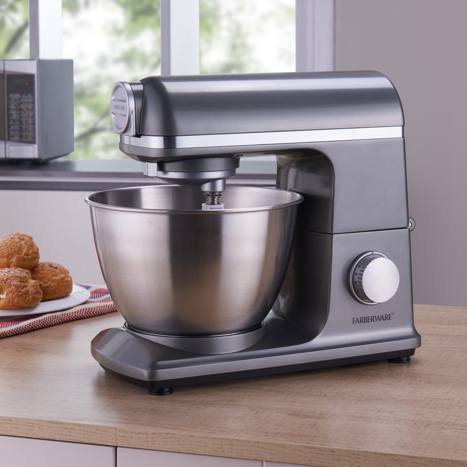 Expand your home’s kitchen capabilities with the Farberware 6 Speed Gun Metal Stand Mixer. This premium stand mixer allows you to whip, chop, mix and blend so that you can achieve mouthwatering results that will surprise and delight all of your dinner guests. Switch between the 6 different speeds to make your family’s favorite recipes or venture out and experiment with some new culinary creations. The sturdy stand mixer comes equipped with a large 4.7-quart stainless steel bowl and a range of removable mixing attachments to help you get the job done with unparalleled efficiency. After your meal has been served on the table or packed away for later in the fridge, put the bowl and attachments into the dishwasher for swift and stress-free clean-up. The simple design of the Farberware 6 Speed Stand Mixer will allow you to create healthy meals that will please your taste buds. Plus, the durable die-cast metal body is designed with a stunning gunmetal finish that will complement your other kitchen appliances and modern design aesthetic. Bring home the Farberware 6 Speed Stand Mixer and let the cooking and baking fun begin!