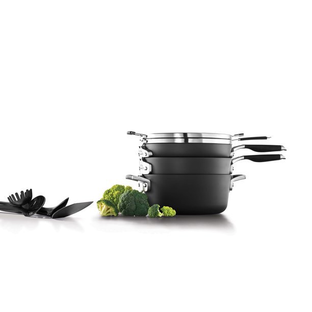 Select by Calphalon Space-Saving Hard-Anodized Nonstick Cookware securely stacks to save 30% more space.* Plus, the unique cookware design and flat glass covers stack and nest in any order.** This cookware set features popular pots and pans needed for everyday cooking, and they are dishwasher-safe for easy cleanup. The cookware features a medium-gauge, hard-anodized construction for long-lasting durability, and the dual-layered nonstick interior is ideal for easy food release and cleaning. This nesting cookware set is oven-safe up to 400 degrees F for heating and warming versatility, and features stay-cool long handles with a silicone comfort grip that provide heat resistance when cooking on the stovetop. The Select by Calphalon Space-Saving Hard-Anodized Nonstick Cookware 14-Piece Set includes 8″ and 10″ diameter cookware which form two separate stacks to save more space in the kitchen. *Average space saved vs. like non-stacking Calphalon cookware items. **Cookware must have same diameter.
