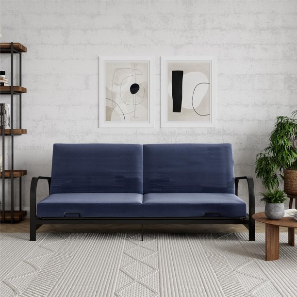 Mainstays Metal Arm Futon, Black Metal Frame with Blue Mattress